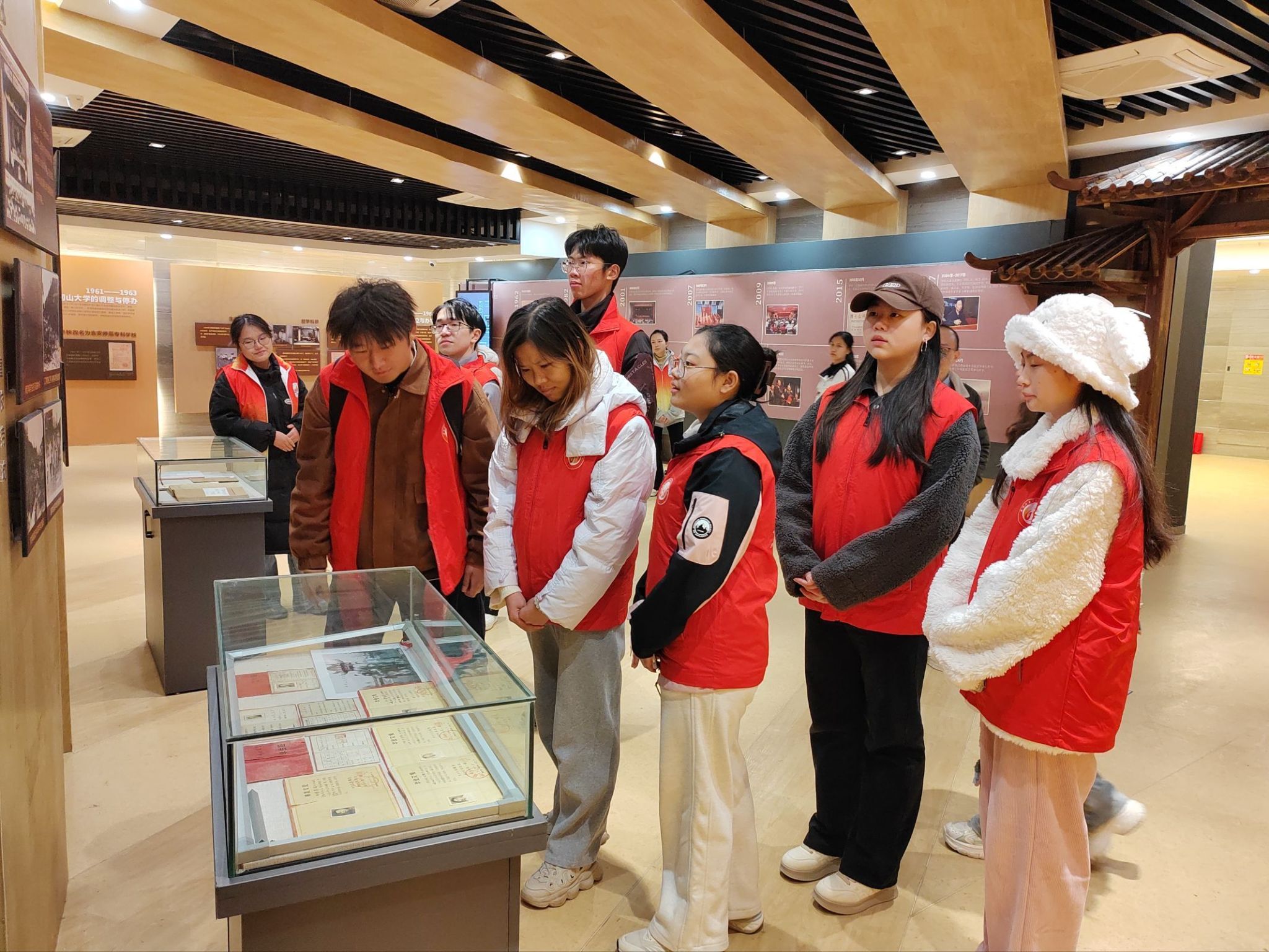 同学们循着历史足迹,在珍贵史料与生动叙事中,全景式感受学校六十七载栉风沐雨、弦歌不辍的办学历程。在讲解员的专业引导下,同学们依次参观了“缘起”“承继”“发展”“展望”四个展区。从泛黄的老照片到厚重的荣誉证书,从早期的教学仪器到如今的科研成果,每一件实物、每一段文字都承载着井大人的初心使命,社员们驻足凝视、悉心研读,不时交流感悟,深刻体会学校在人才培养、科学研究、社会服务等方面取得的辉煌成就。