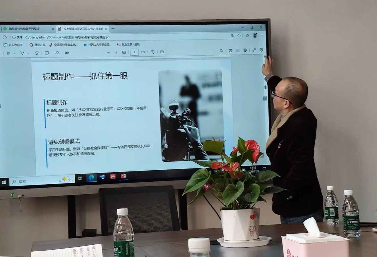 活动伊始,郭美军老师围绕“校友新闻采写”主题,带来了一系列实用写作方法。他强调,校友新闻的生命力源于“真实与细节”——应避免笼统叙述,多采用校友或同学的真实话语;采访前需做足功课,深入了解校友的行业成就,设计有针对性的问题,让内容更具深度。同时,倾听与追问不仅是尊重受访者的体现,更是挖掘独特故事与情感的关键。郭老师还指出,优秀的新闻工作者应懂得根据现场情况灵活调整节奏,让前期准备与临场应变相配合,真正触及采访核心。此外,主题设计对提升稿件质感尤为重要,这让大家对如何撰写“有温度、有高度”的校友新闻有了更清晰的认识。