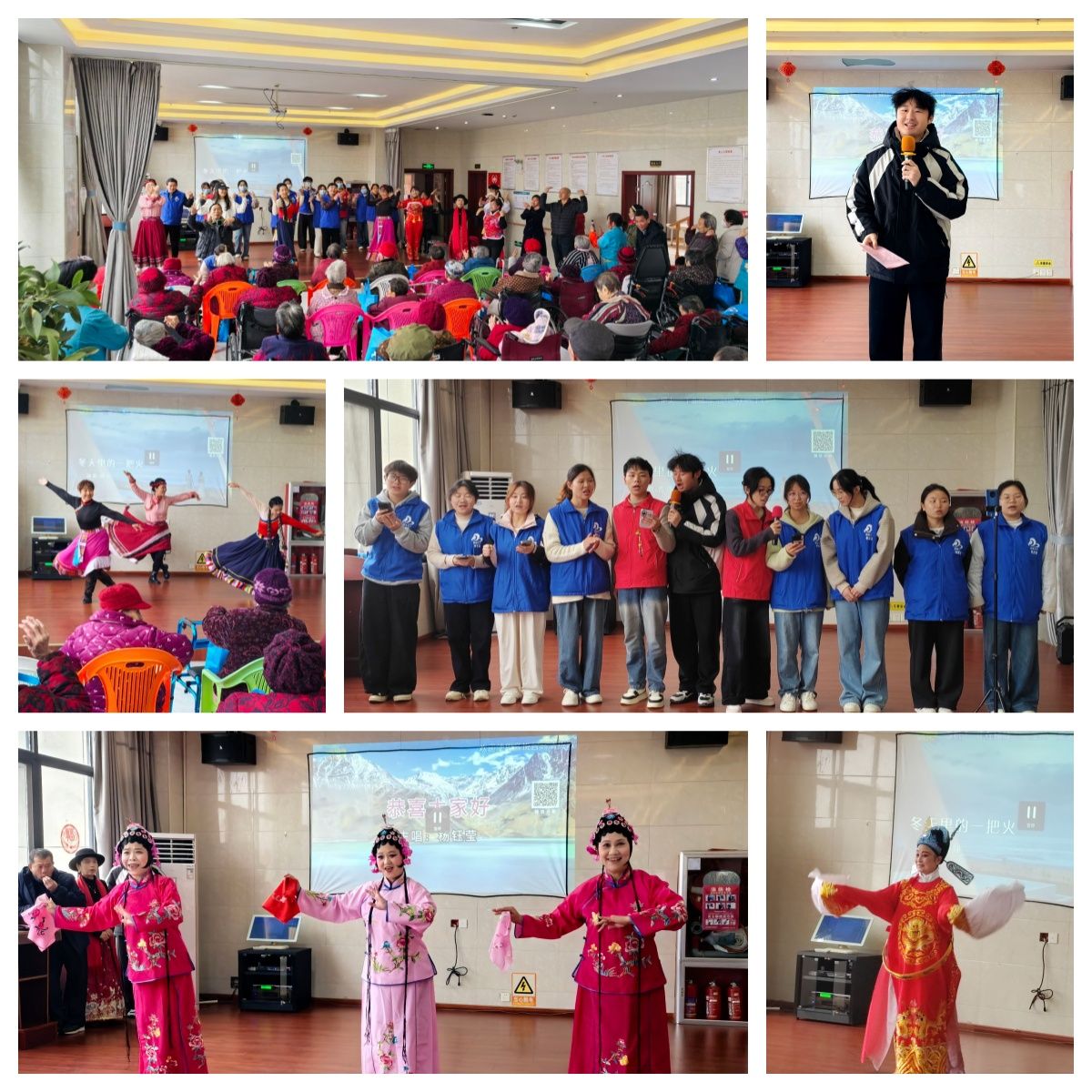 活动现场暖意融融、气氛温馨,处处洋溢着欢乐与祥和。丰富多彩的文艺节目依次登台亮相,轻快的鼓点、优美的舞姿、深情的演唱与经典的戏曲唱腔相互交织,为平日里安静的院落增添了满满的生机与活力,台下不时响起阵阵热烈的掌声,欢声笑语回荡在养老院的每一个角落。
