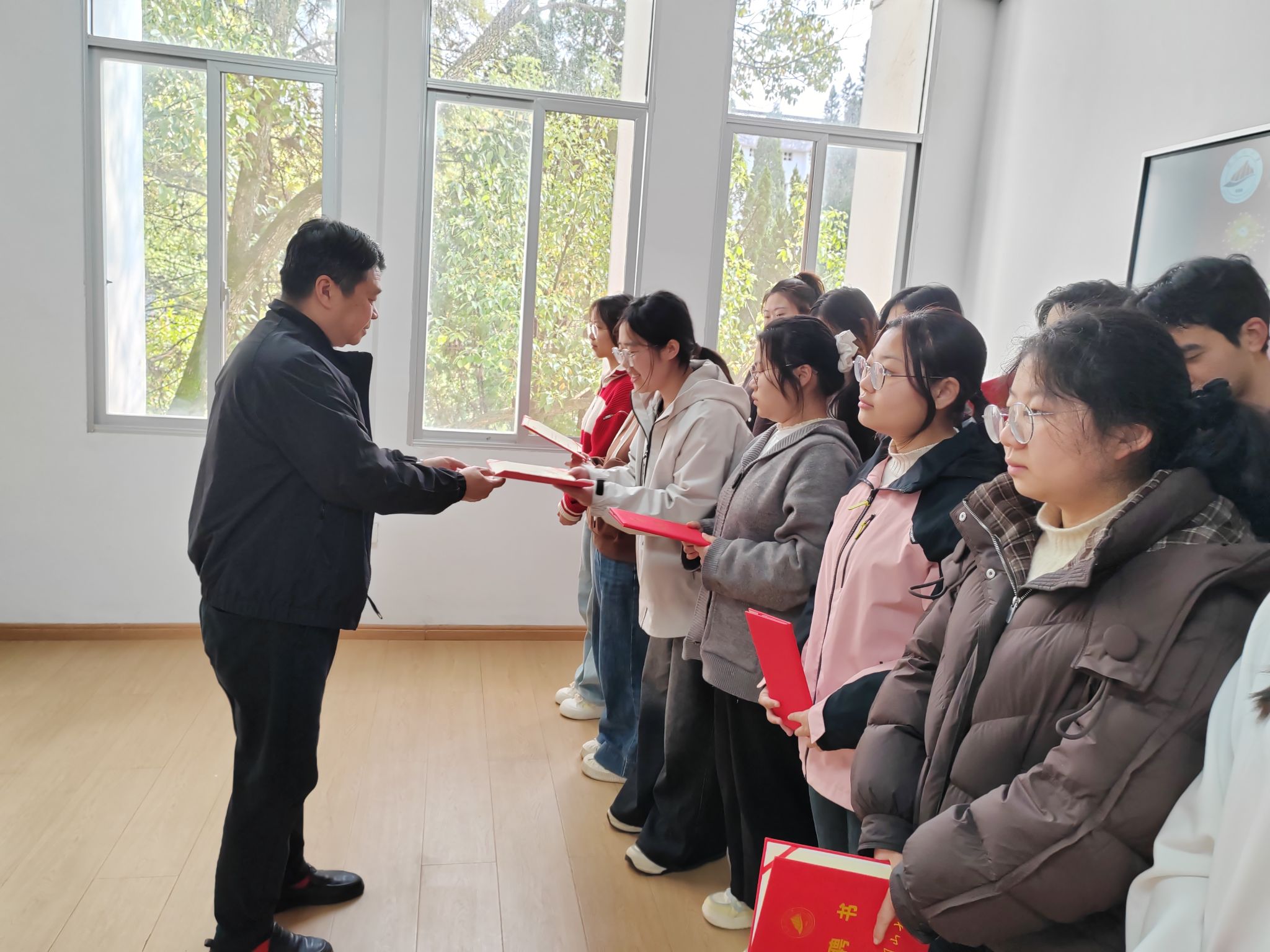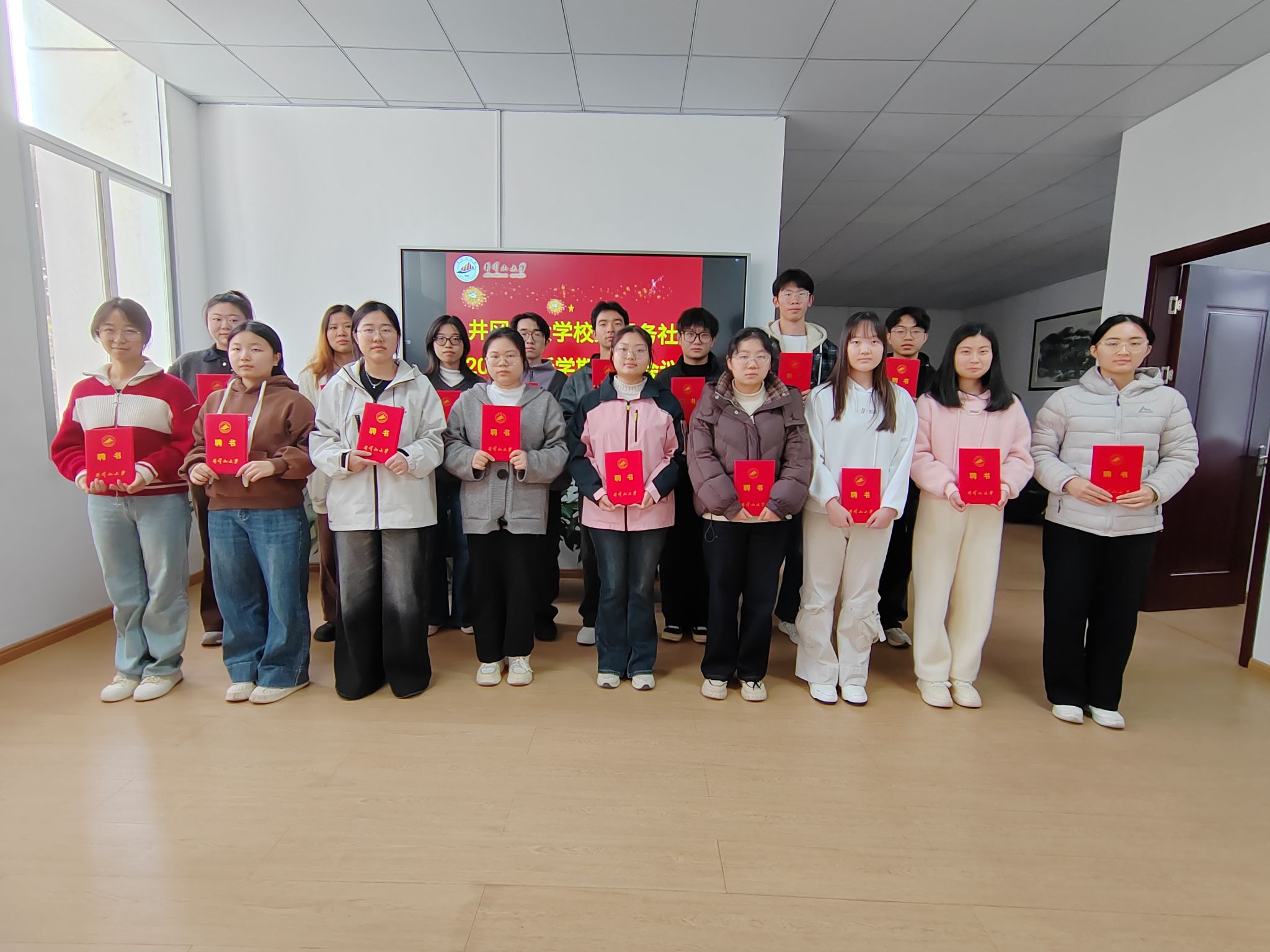 会议伊始,郭美军老师宣读了第二届社团成员名单,三位老师共同为全体成员颁发聘书,大家精神抖擞,郑重接过这份承载着荣誉与责任的聘书。受聘环节庄重而温馨,全体成员手持鲜红的聘书与老师们一同合影留念,将这份光荣与初心永久定格。