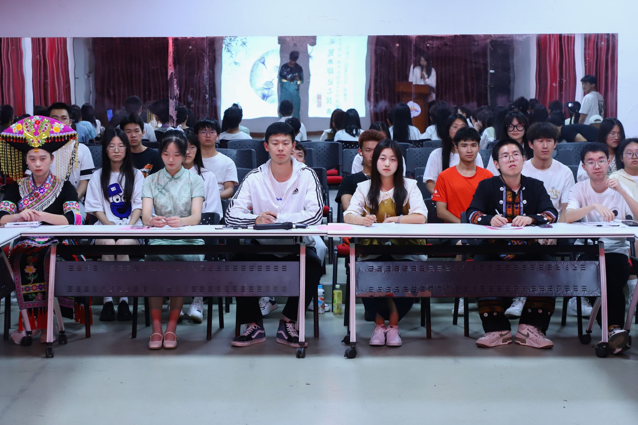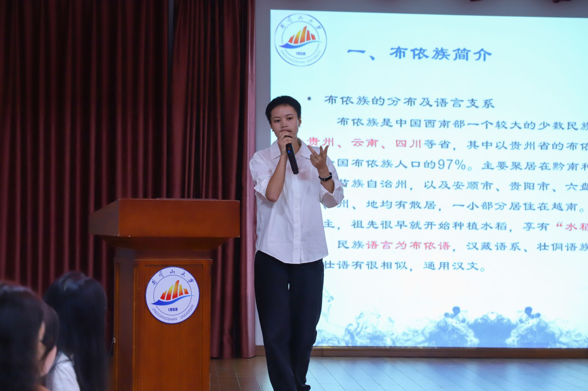 在民族文化宣讲环节,政法学院研究生梁睿、数理学院姜鑫炎和马克思主义学院王梦璇通过PPT、视频、实物展示等多种形式,缓缓展开布依族、汉族和土家族等千年文化的厚重篇章,从古老的语言到多彩的服饰文化,从独特的建筑风格到丰富的节日庆典,他们用深情的讲述和生动的图片,将各民族的历史、文化、风俗习惯一一呈现,展示了各民族文化的博大精深和独特魅力。