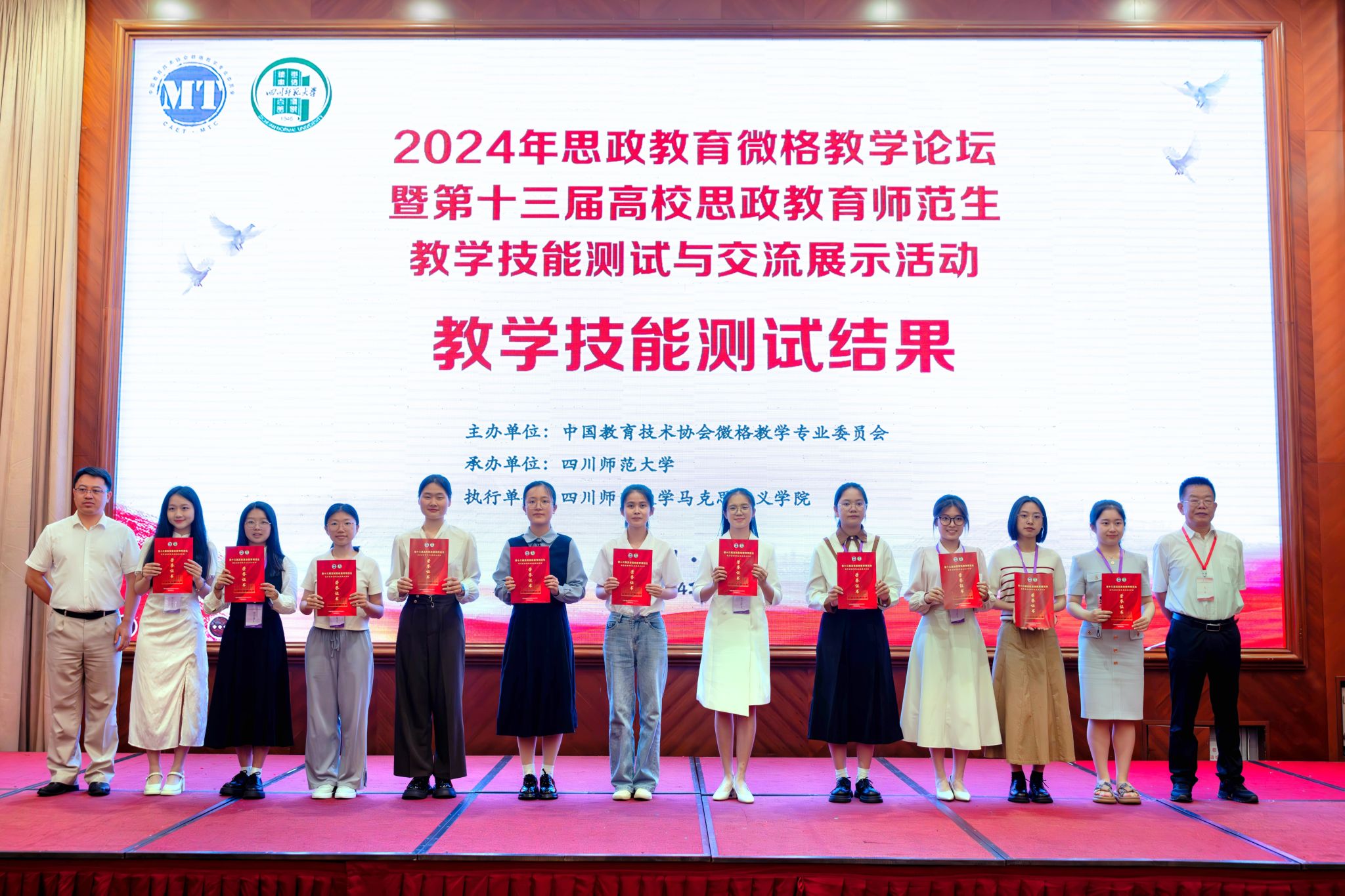 5月24日至27日,2024年思政教育微格教学论坛暨第十三届高校思政教育师范生教学技能测试与交流展示活动在四川师范大学举行。该活动由中国教育技术协会微格教学专业委员会主办,四川师范大学承办。来自华中师范大学、东北师范大学、华南师范大学、西南大学等全国89所高校的409名本科生,44所院校的138名思政研究生参加了此次活动。我校马克思主义学院思想政治教育专业的6名学生表现优异,以独具匠心的教学设计、引人入胜的教学展示、沉着冷静的答辩,荣获一等奖3项,二等奖2项,三等奖1项。这是我校参加该项赛事以来取得的最好成绩。