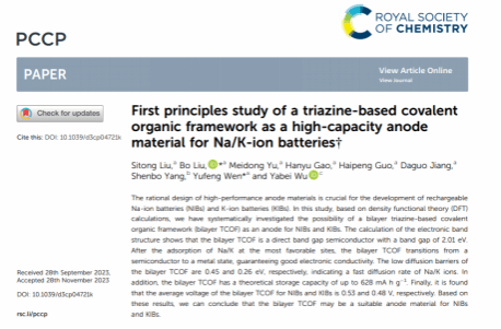 近日,数理学院2021级物理学专业本科生刘思彤以第一作者身份在国际学术期刊《Physical Chemistry Chemical Physics》 (IF=3.3,JCR二区TOP),发表题为: “ First principles study of a triazine-based covalent organic framework as a high-capacity anode material for Na/K-ion batteries ”的研究论文(DOI: 10.1039/d3cp04721k),通讯作者为刘波老师和温玉锋老师。论文报道了一种双层三嗪基共价有机框架材料(双层TCOF)作为钠离子电池(NIBs)和钾离子电池(KIBs)负极的可能性。通过第一性原理计算发现,双层TCOF是一种直接带隙半导体,带隙为2.01 eV。当钠或钾原子吸附在最有利的位置上时,双层TCOF会从半导体状态转变为金属状态,这有助于提高电子导电性。此外,双层TCOF展示了高的理论储能容量(628 mAh/g)、低的离子扩散势垒(0.45和0.26 eV)和平均嵌钠/钾电压(0.53 V和0.48 V)等方面的优异性能,为未来高性能电池的开发提供了理论基础和指导。(文:刘思彤、刘波;审核:孙心瑗、习军明)