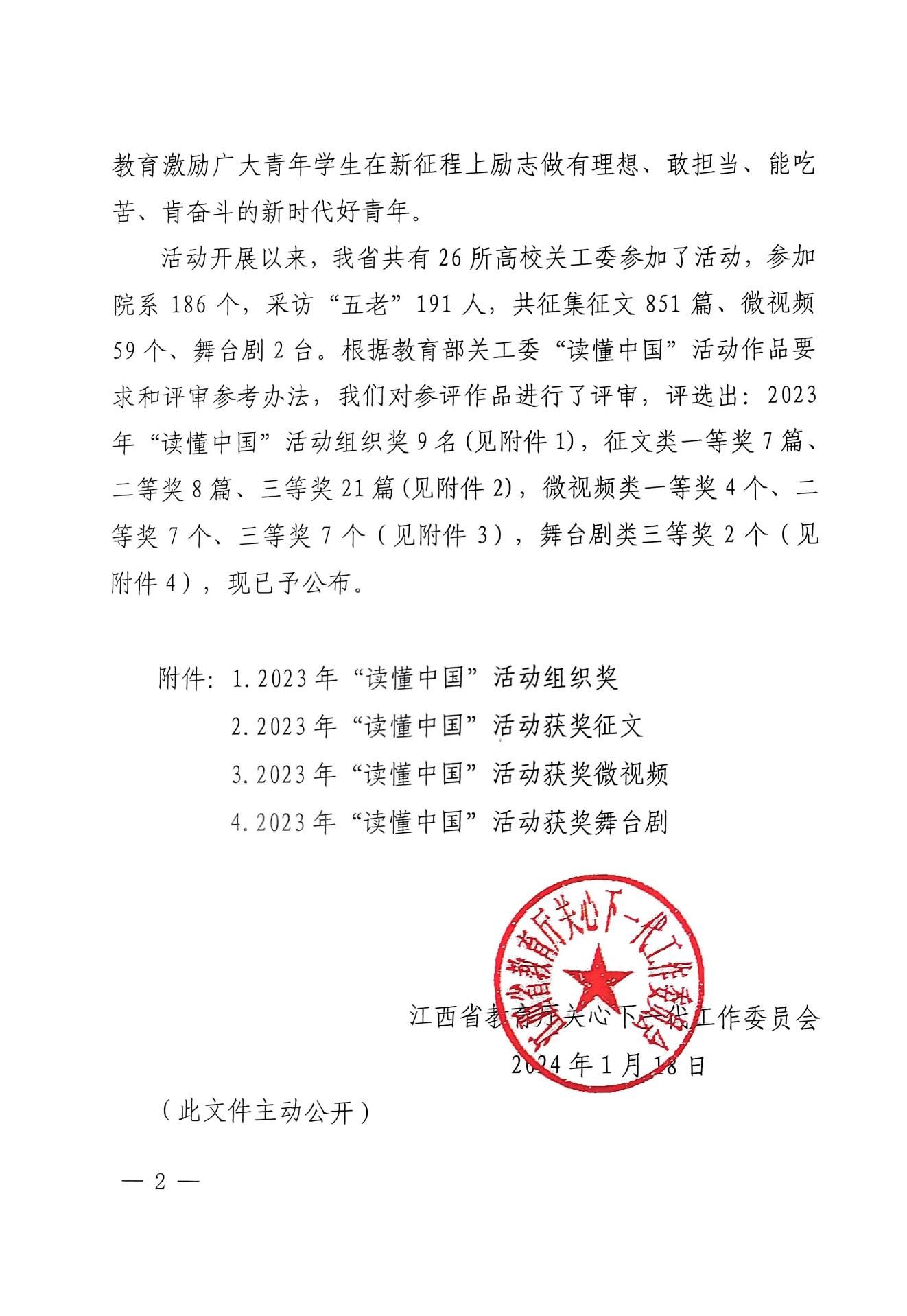 近日,省教育厅关工委发布全省高校2023年“读懂中国”活动作品评审结果,我校选送的征文、微视频、舞台剧获得良好成绩,其中《一片“痴”心献庐陵》获征文一等奖、《用心倾听开花的声音》获征文二等奖、《以爱育人,润物无声》《一路繁华似锦》获征文三等奖、《红色沃土育桃李》获微视频二等奖、《向阳冬升》获舞台剧三等奖。我校还获2023年“读懂中国”活动组织奖。