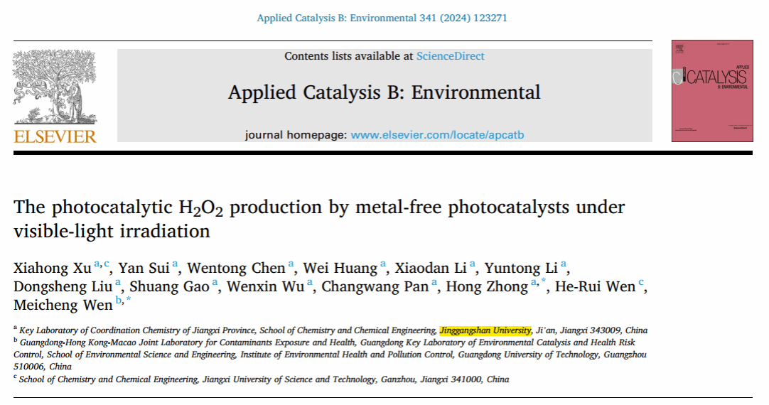 近日,我校化学化工学院钟鸿博士团队应邀在化学领域TOP期刊《Applied Catalysis B: Environmental》(IF=22.1)发表题为“The photocatalytic H2O2 production by metal-free photocatalysts under visible-light irradiation”的综述文章,我校为论文第一通讯单位。研究得到了国家自然科学基金(22075286, 22161023, 42077332)、江西省自然科学基金(20224ACB214004, 20232ACB203001,20212BAB214029)、江西省教育厅科技项目(GJJ211003, GJJ211042、GJJ2201641)、井冈山大学博士科研启动项目等项目的资助。
