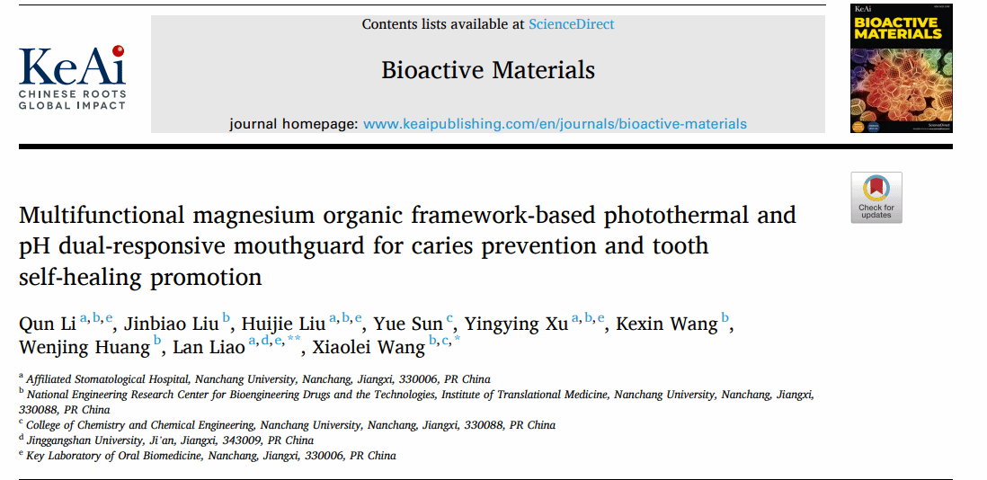 作为井冈山大学和南昌大学的联合学术成果,2023年6月29日,井冈山大学副校长、南昌大学博导廖岚教授团队联合南昌大学王小磊教授团队,在1区TOP期刊Bioactive Materials(IF 18.9)就以上问题,在线发表了题为“Multifunctional magnesium organic framework-based photothermal and pH dual-responsive mouthguard for caries prevention and tooth self-healing promotion.”的文章,将“pH+光热”响应体系应用于龋病预防及治疗,设计了一种“内外兼修,双管齐下”并且操作方便的新型泡沫护齿器MPC-CB。