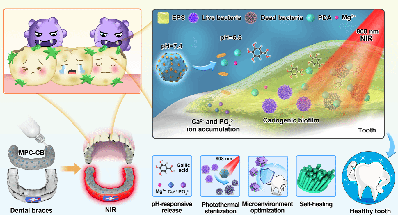 龋病被世界卫生组织认定为全世界最常见的非传染性疾病,其病因为长期黏附在牙齿表面的细菌生物膜,代谢产生有机酸导致局部低pH(pH < 5.5)环境,进而造成牙体硬组织无机物脱矿以及有机物分解。目前的治疗中,如何具体识别酸性部位、精准干预、逆转易龋环境,同时修复牙体缺损仍然是一个挑战。