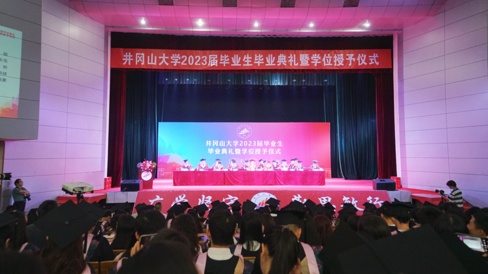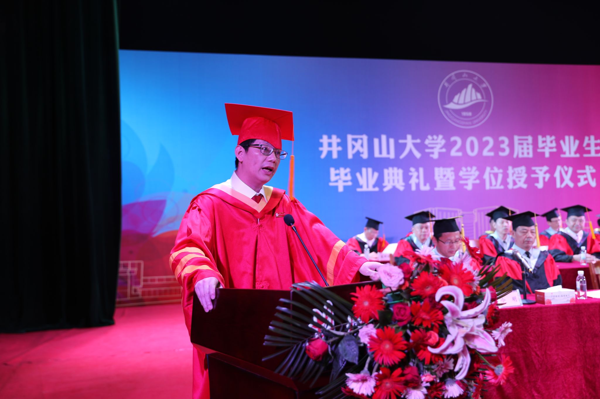 校党委书记胡春晓出席,校党委副书记、校长罗旭彪讲话,党委常委、副校长陈小林宣布2023届研究生、本专科生毕业生名单和硕士、学士学位获得者名单,党委常委、副校长黄俭根宣读2023届优秀毕业生名单,党委常委、副校长冷明主持毕业典礼暨学位授予仪式。校领导史胜平、肖宜安、李军、刘利民出席。各学院(部)学位评定分委员会主席,校友代表,家长代表,以及各学院和有关职能部门负责人,教师代表等,参加毕业典礼。本次毕业典礼共计1000余人参加,为方便在外学子参与毕业典礼,校党委宣传部、融媒体中心通过首次通过井冈山大学视频号进行全程直播,吸引了数万师生、家长和校友观看直播。