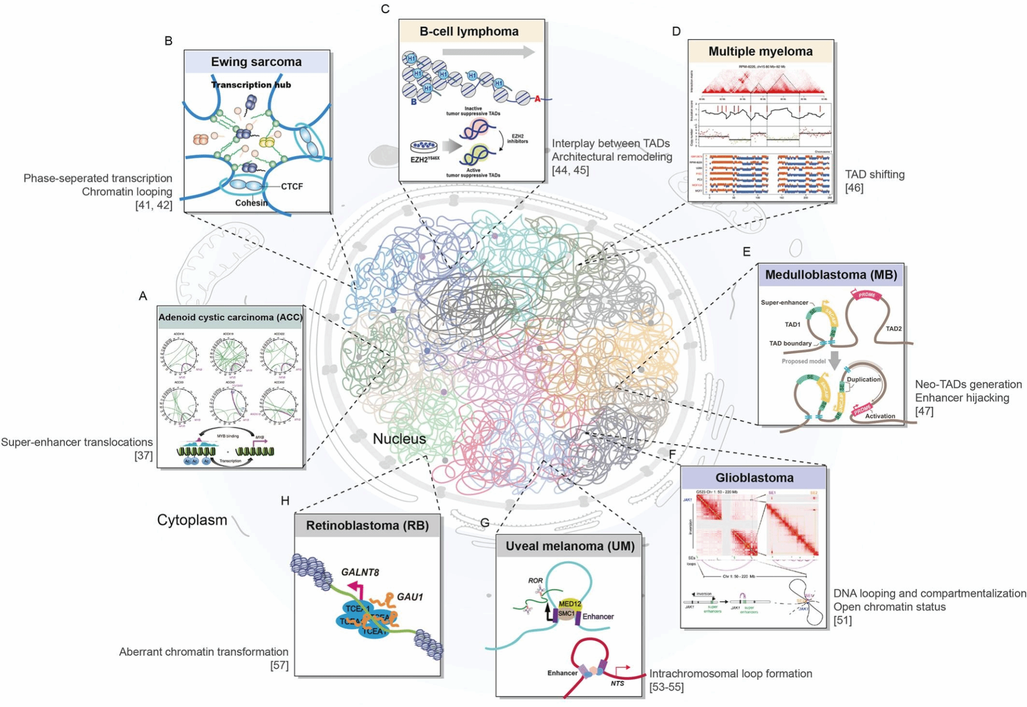 众所周知,基因功能异常是恶性肿瘤发生发展的根本原因之一,染色质上的表观遗传调控紊乱则是造成基因功能异常的一种最重要方式。染色质是生命活动所必需的遗传物质,在三维空间上具有高度的动态可塑性,这种染色质三维空间构象常在基因转录沉默和激活中发挥核心调控作用,也是恶性肿瘤发生发展过程中的关键调控因素之一。文章聚焦多种罕见恶性肿瘤,包括腺癌、骨肿瘤、血液肿瘤、脑肿瘤、眼肿瘤等,从染色质三维空间构象异常的角度,全面梳理了染色质三维空间构象在罕见恶性肿瘤中的关键作用和调控机制,总结和展望了基于染色质三维构象的药物靶点发现和靶向治疗研究现状,为罕见肿瘤的发生机制研究提供了新见解,有助于推动罕见恶性肿瘤的精准诊疗研究。