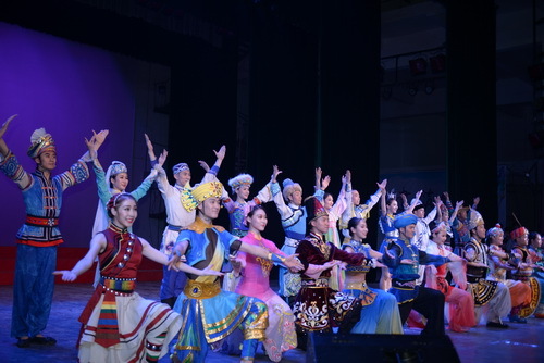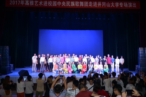 演出结束后,校领导走上舞台接见中央民族歌舞团全体演员并合影留念。