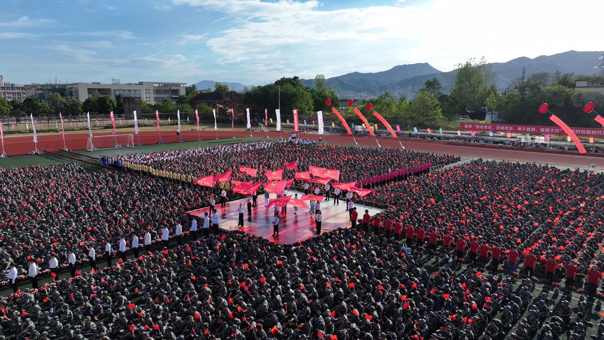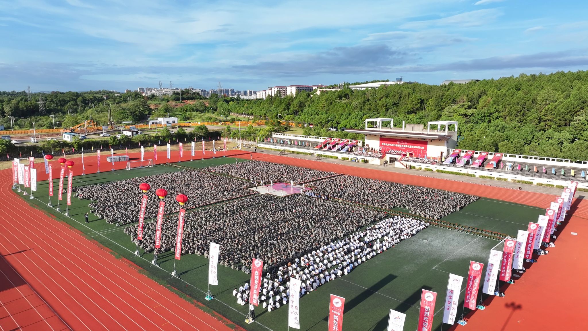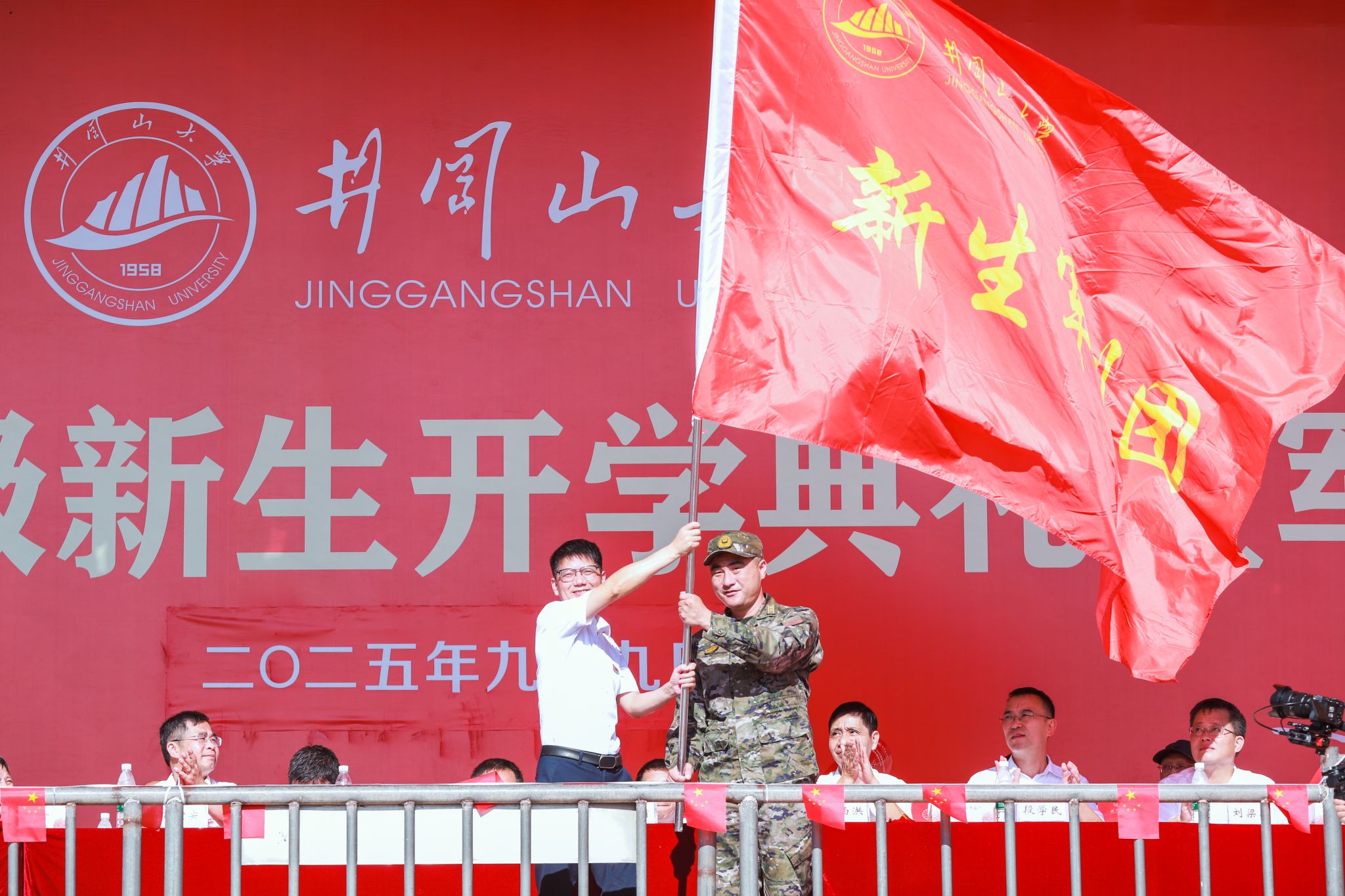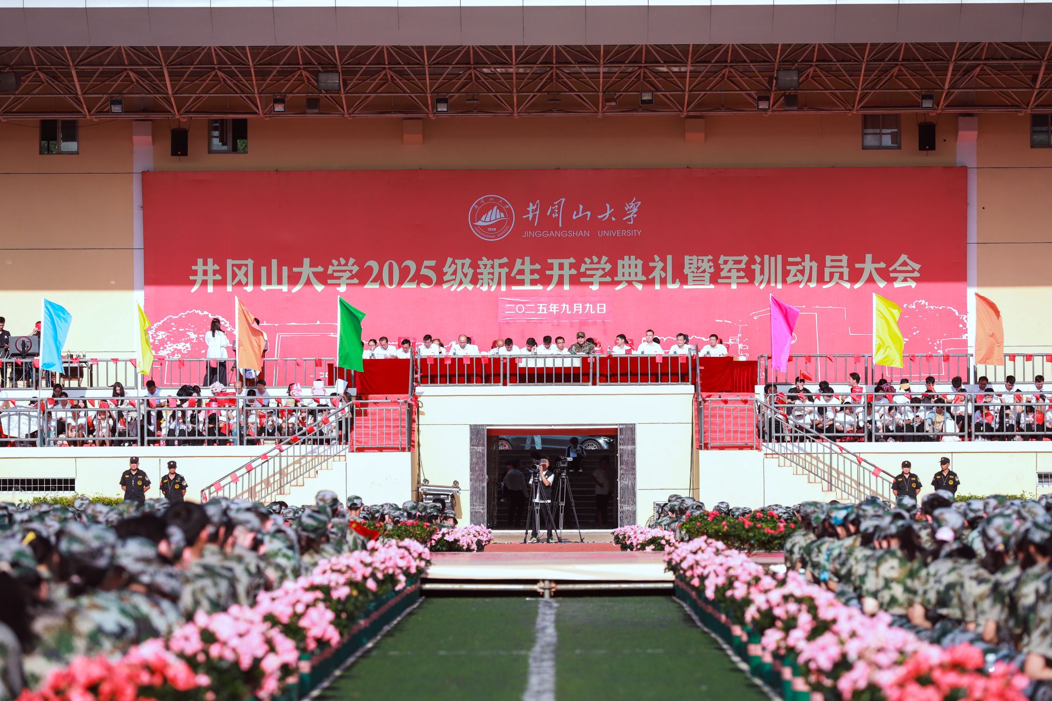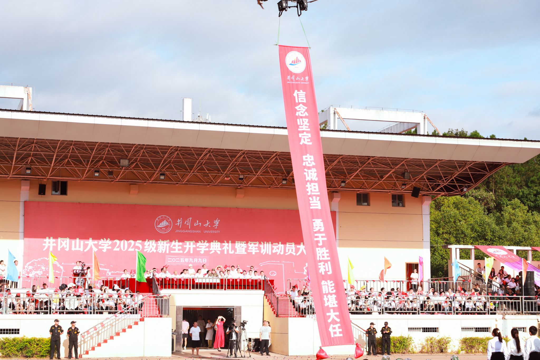 9月9日,我校 2025 级新生开学典礼暨军训动员大会圆满举行。校党委书记罗旭彪出席大会,并为军训团授旗;武警吉安支队副参谋长、军训团副团长王兆清宣布军训计划并作动员安排。全体在家的校领导,学校有关部门、学院负责人,教师代表、全体辅导员,2025级8409名本科新生、402名研究生以及他们的班主任共同参加典礼。校党委常委、副校长敖四江主持典礼。3万5千余名校友、学生家长、社会友人通过网络直播的方式,观看了典礼。