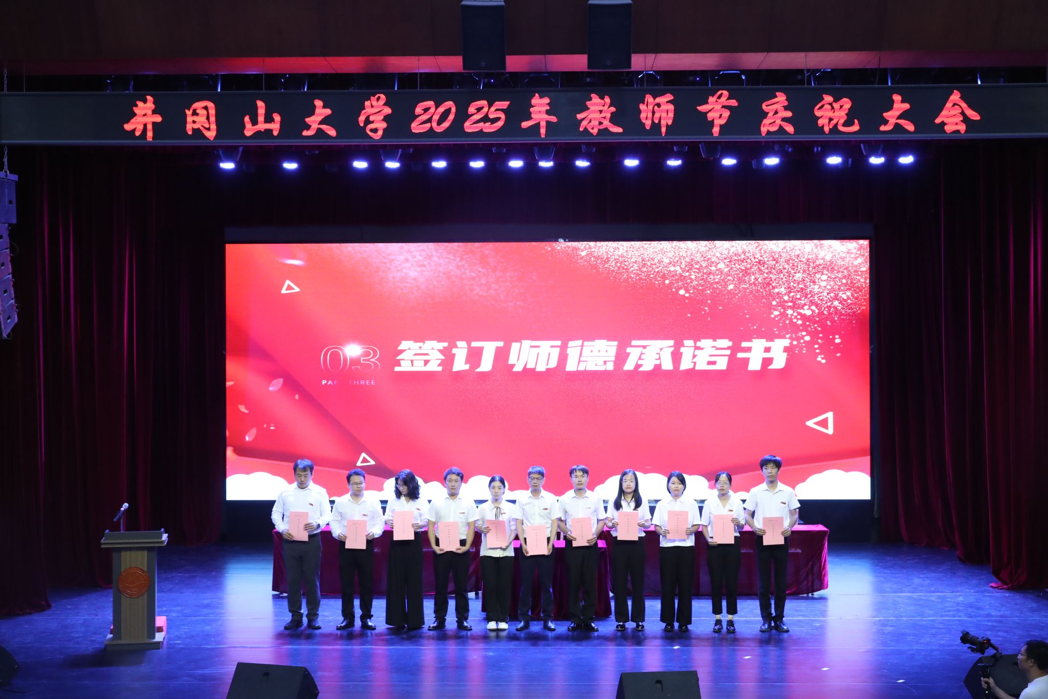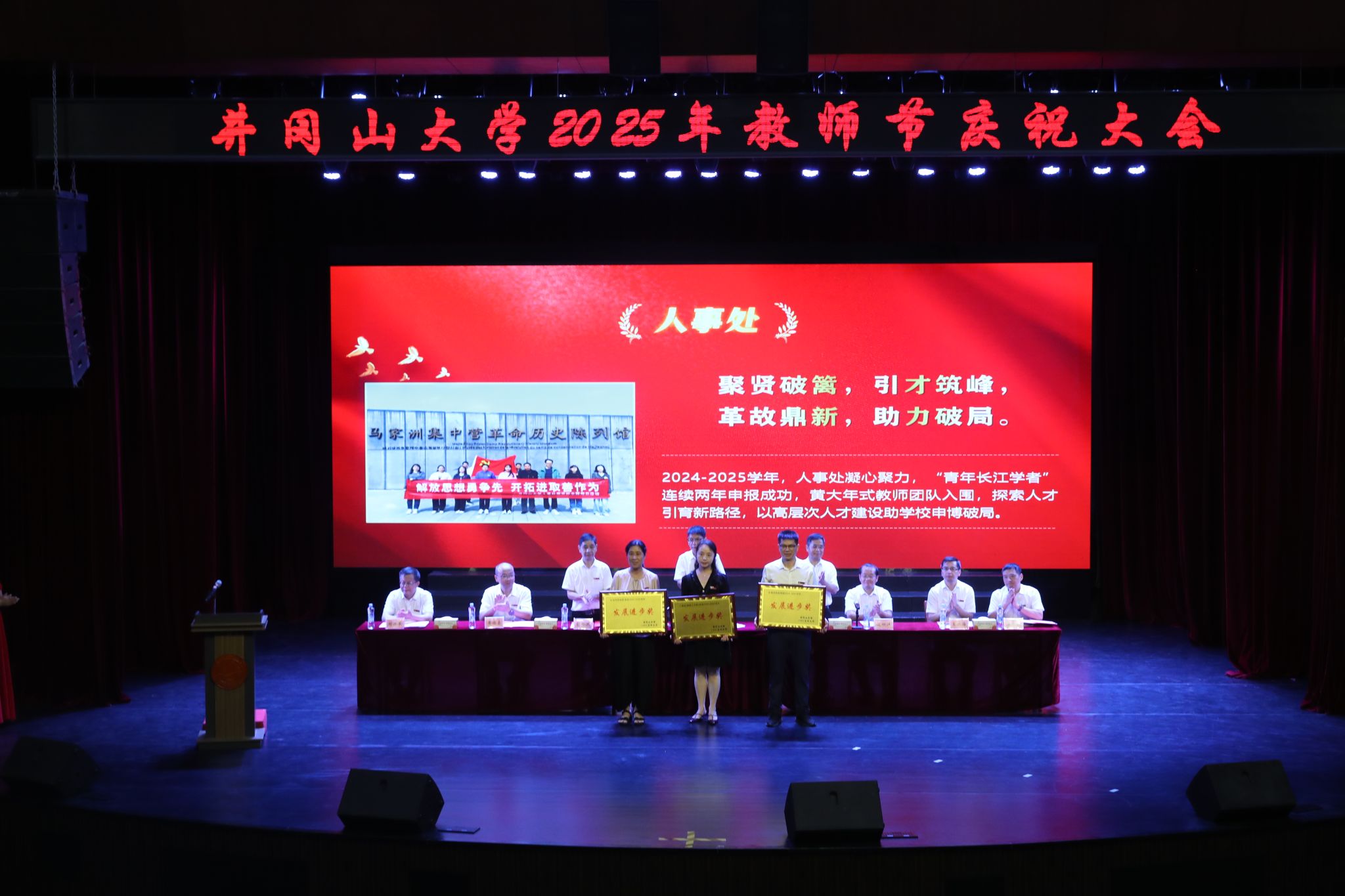 表彰环节,肖宜安表彰环节,肖宜安通报了2024-2025学年我校集体和个人获得各类表彰情况。党委常委、纪委书记彭西洪宣读了《关于表彰井冈山大学2024-2025学年“发展进步奖”“突出贡献奖”获得者的决定》;副校长敖四江宣读了2025年长期从教教师名单。发展规划处等三个发展进步奖单位,杨利明等四位突出贡献奖个人,苏小河等二十名长期从教教师代表受到了大会的隆重表彰。同时大会还为坚守与奋斗了一辈子、即将开启退休生活的九名退休教职工代表颁发荣退证书,佩绶带。