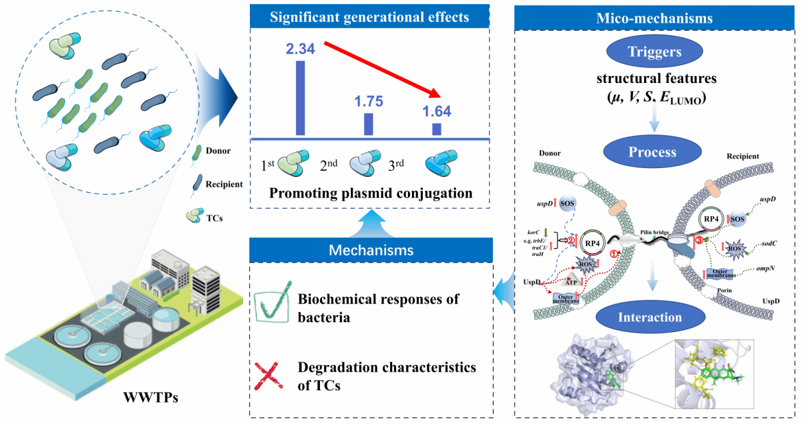 抗生素的世代效应在医药领域已被广泛证实。抗生素可通过促进耐药质粒接合转移等途径显著诱导传播抗生素抗性基因;然而,抗生素促进细菌间的耐药质粒接合转移是否存在世代效应?其形成机制?均不清楚。为此,通过构建四环素类抗生素(TCs)—污水处理中典型细菌耐药质粒接合转移体系,采用接合转移、分子模拟、量子化学计算及组学等技术,系统比较了不同世代TCs对污水中质粒接合转移的影响及其机制。结果表明,TCs显著提升接合转移效率且呈显著世代差异:第1代促转移效应分别为第2和第3代的4.46~5.95倍。降解和生化实验表明,世代效应与TCs降解特性无关(P > 0.05),而与细菌的活性氧水平、外膜通透性及ATP合成等生化响应密切相关(P < 0.05)。机制研究进一步证实,不同世代tcs的关键结构参数差异导致其与应激蛋白的相互作用不同,进而影响供体菌内耐药质粒相关基因表达及生化过程,从而决定接合转移频率(P < 0.001)。论文首次阐明了抗生素在污水处理系统中耐药质粒传播的世代效应及其形成机制,为抗生素抗性基因的阻控提供了理论支撑。研究工作得到了国家自然科学基金(32160303,52370202,52125002)、江西省双千计划(jxsq2023201061)等项目的资助。论文链接: https://www.sciencedirect.com/science/article/abs/pii/S0043135425011960