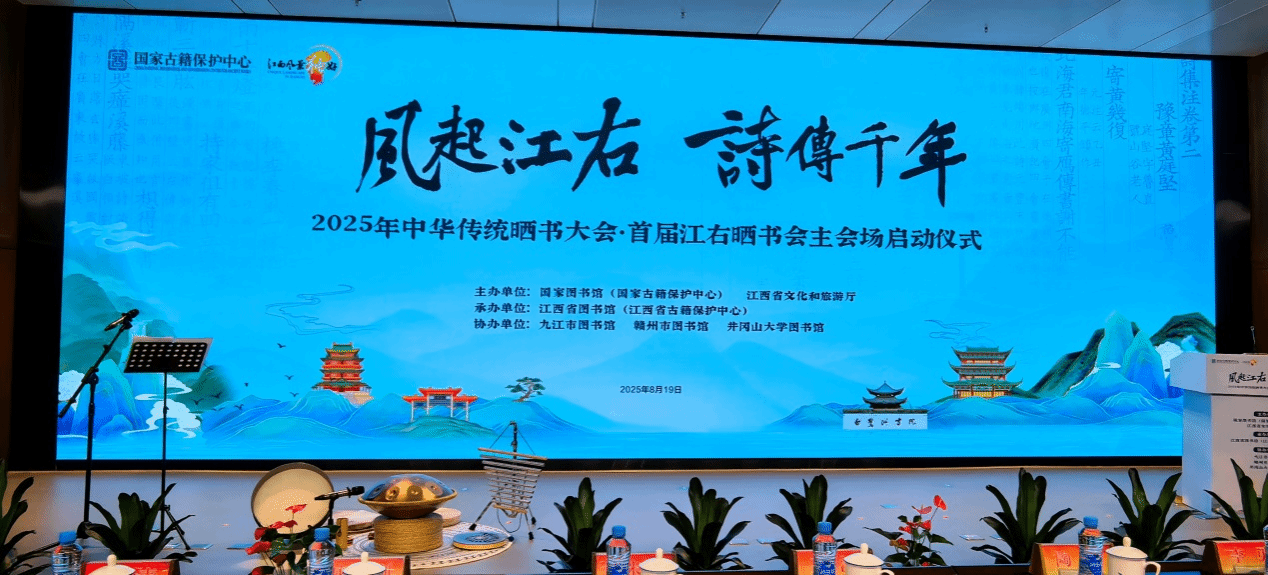 2025年中华传统晒书大会•首届江右晒书会由国家图书馆(国家古籍保护中心)、江西省文化和旅游厅联合主办,井冈山大学图书馆参与协办。活动旨在深度挖掘与活化利用以江西诗派为代表的珍贵文化遗产,让书写在古籍里的文字“活”起来。江西省图书馆、井冈山大学图书馆等四家单位分别展示与讲述了“江西诗派”相关古籍,帮助读者直观了解该诗派的传承脉络及重要影响。
