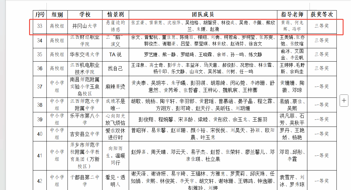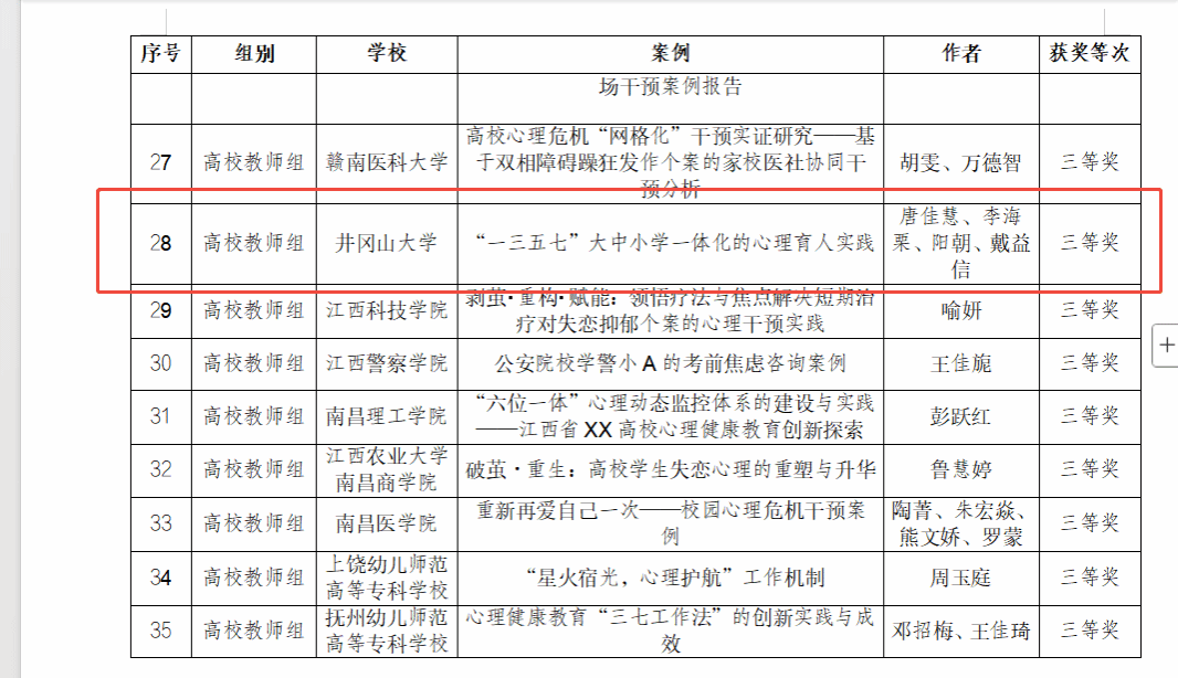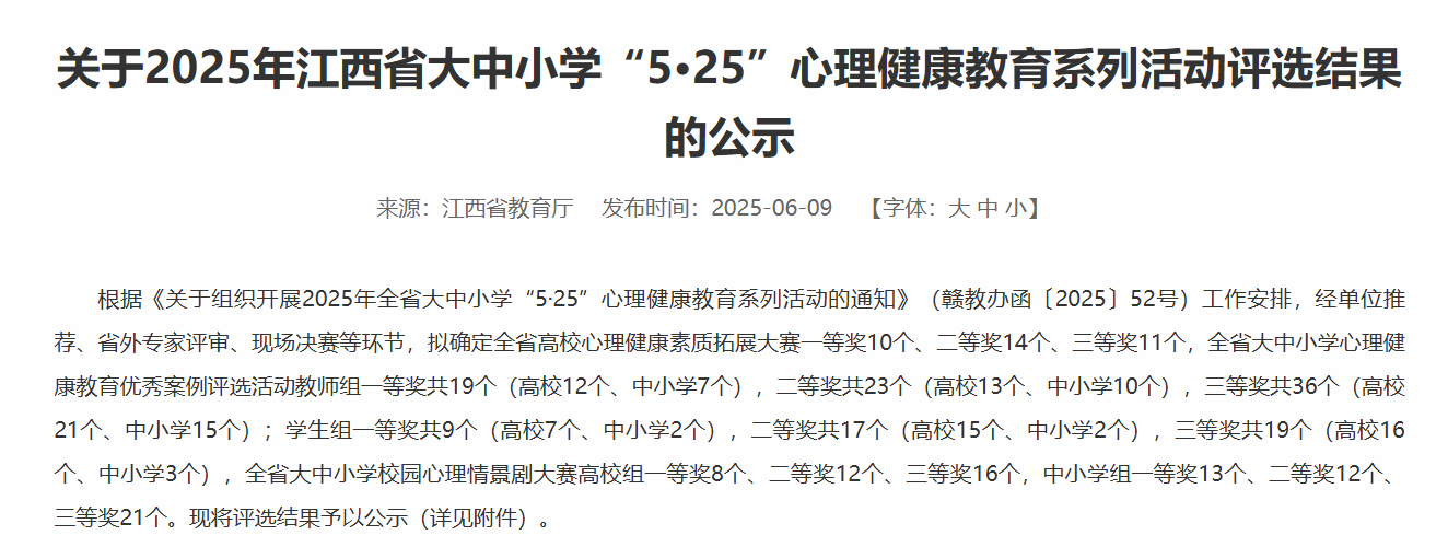根据《关于组织开展2025年全省大中小学“5·25”心理健康教育系列活动的通知》(赣教办函〔2025〕52号)要求,近期,省教育厅组织开展了全省高校心理健康素质拓展大赛、全省大中小学心理健康教育优秀案例评选活动和全省大中小学校园心理情景剧大赛。我校积极报名参赛,获得二等奖1项,三等奖3项。