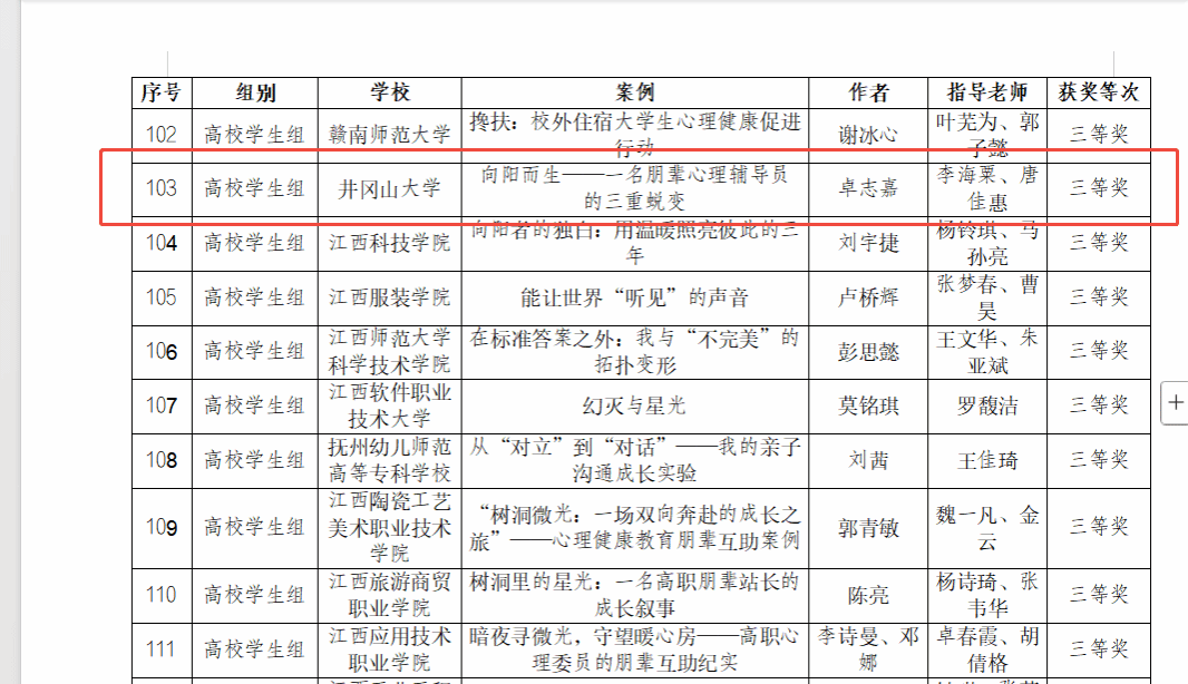 我校唐佳慧、李海栗等老师撰写的心理工作案例《“一三五七”大中小学一体化的心理育人实践》获全省大中小学心理健康教育优秀案例评选活动教师组三等奖。我校卓志嘉同学撰写的心理工作案例《向阳而生——一名朋辈心理辅导员的三重蜕变》(李海粟、唐佳慧指导)获全省大中小学心理健康教育优秀案例评选活动学生组三等奖。(文、图:朱丽丽)