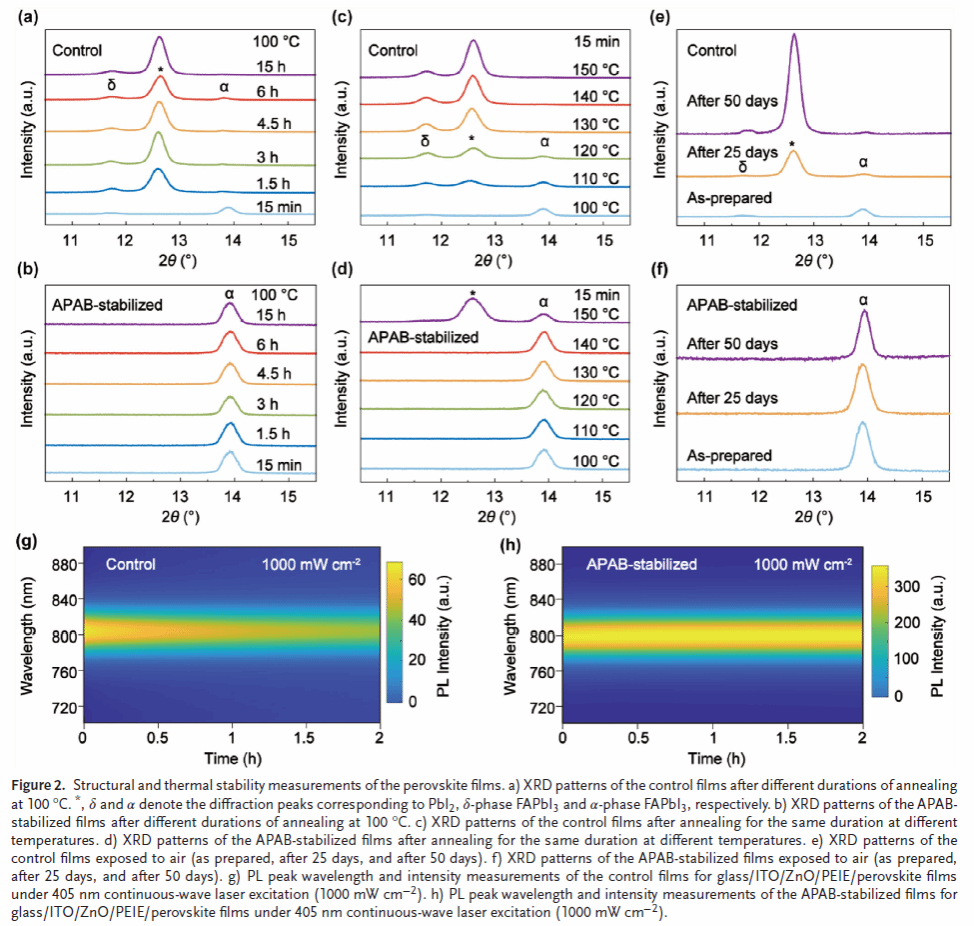 该研究的核心在于通过采用一种含有甲脒基团的多功能稳定剂APAB,成功开发了具有更高热耐受性的钙钛矿材料,能有效防止α-FAPbI₃钙钛矿在高温下的相变和分解。基于此,钙钛矿发光二极管(PeLED)实现了约24.7%的峰值外量子效率(EQE),并在70至1200 mA cm⁻2的宽电流密度范围内,EQEs保持在20%以上。器件的最大辐亮度为2270 W sr⁻¹ m⁻2,是目前近红外PeLEDs迄今报道的最高值之一。在高电流密度下内保持高EQE是实现超高辐射亮度的关键。此外,含有APAB器件表现出优异的工作稳定性,在不同恒定电流密度下寿命(T₅₀)显著提升:500 mA cm⁻2时为6.6小时,400 mA cm⁻2时为12.7小时,300 mA cm⁻2时为19.2小时,200 mA cm⁻2时为49.5小时,100 mA cm⁻2时为238.6小时,50 mA cm⁻2时为350小时,这是迄今报道的最稳定的PeLED之一。(图/文:王兆亿; 审核:刘诚、陈文通)