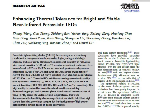 近日,我校化学化工学院王兆亿博士在高稳定近红外钙钛矿发光二极管领域取得重要研究进展,相关研究成果以“Enhancing Thermal Tolerance for Bright and Stable Near-Infrared Perovskite LEDs”为题,以第一作者在国际顶级期刊《Advanced Materials》上发表。