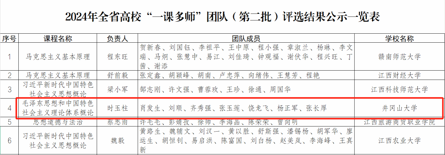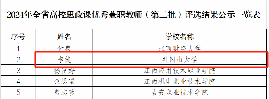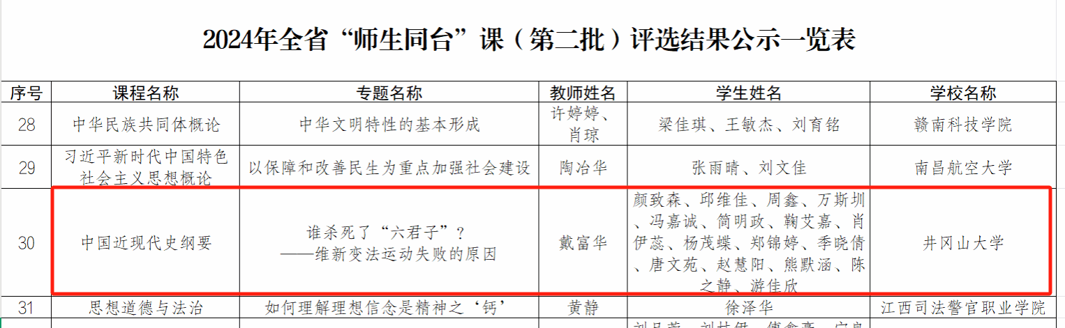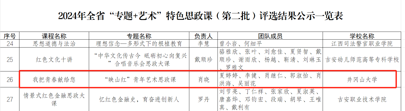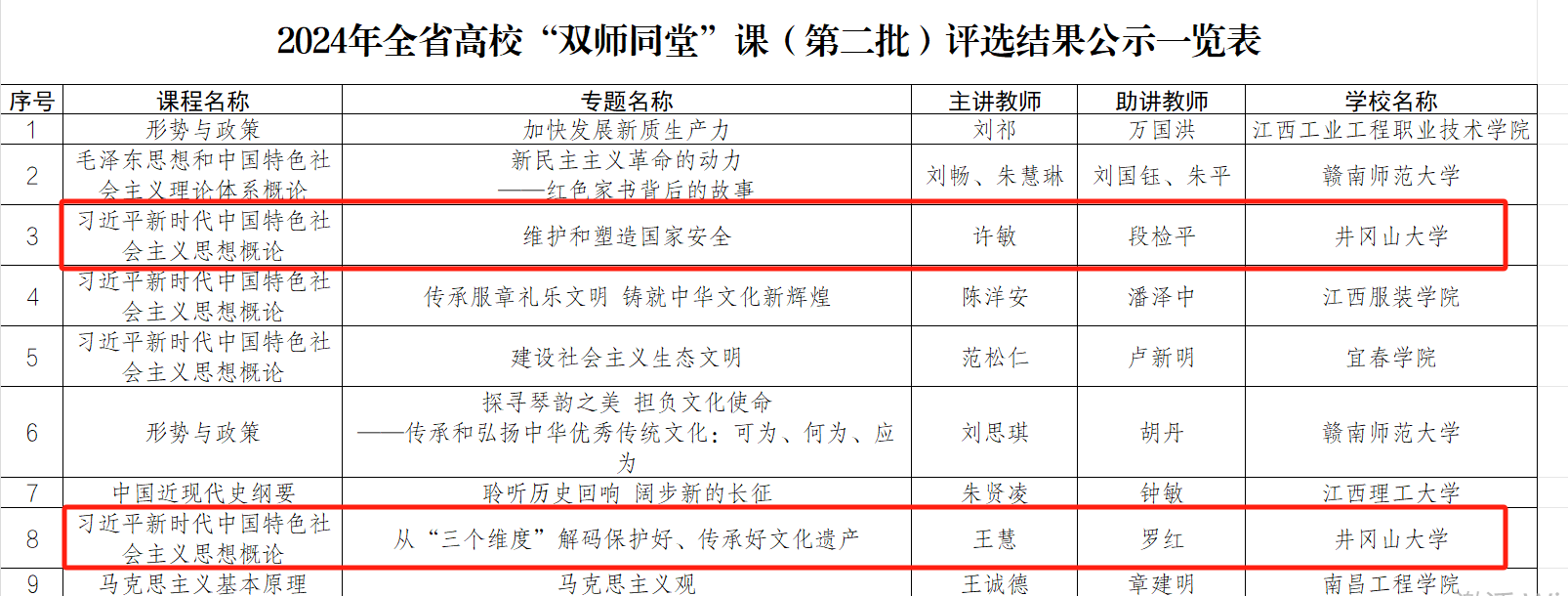 艺术学院李健老师被评为“江西省高校思政课优秀兼职教师”,马克思主义学院时玉柱老师申报的《毛泽东思想和中国特色社会主义理论体系概论》课程获批全省高校“一课多师”团队,马克思主义学院张玉莲老师申报的三湾改编纪念馆实践基地获批全省家门口的“大思政课”实践教学基地,马克思主义学院许敏老师和校外专家段检平老师主讲的专题《维护和塑造国家安全》、马克思主义学院王慧老师和校图书馆罗红老师主讲的专题《从“三个维度”解码保护好、传承好文化遗产》分别获评全省高校“双师同堂”课,马克思主义学院戴富华老师主讲的专题《谁杀死了“六君子”?——维新变法运动失败的原因》获评全省高校“师生同台”课,校团委肖晓书记申报的《“映山红”青年艺术思政课》获批全省“专题+艺术”特色思政课。