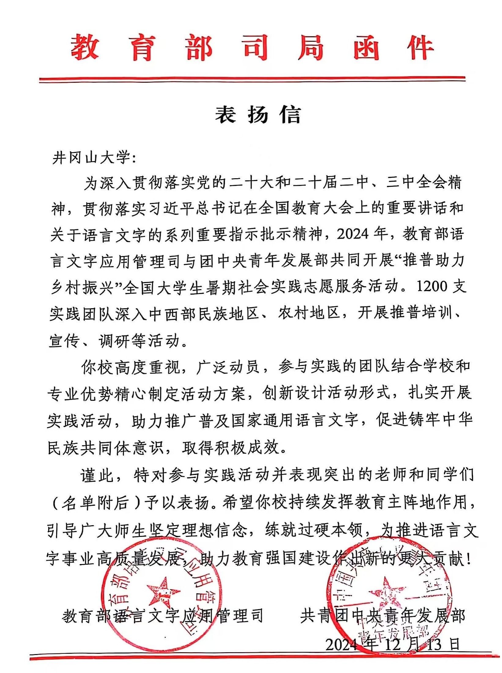 近日,学校收到教育部语言文字应用管理司、共青团中央青年发展部的表扬信,我校由校团委、人文学院组织,罗志春老师指导的“美语助农人,共绘同心圆” 全国大学生推普助力乡村振兴实践团队凭借出色表现、卓越成效,赢得了教育部的高度认可与表扬,实践团队获“推普助力乡村振兴”全国大学生暑期社会实践志愿服务优秀团队。