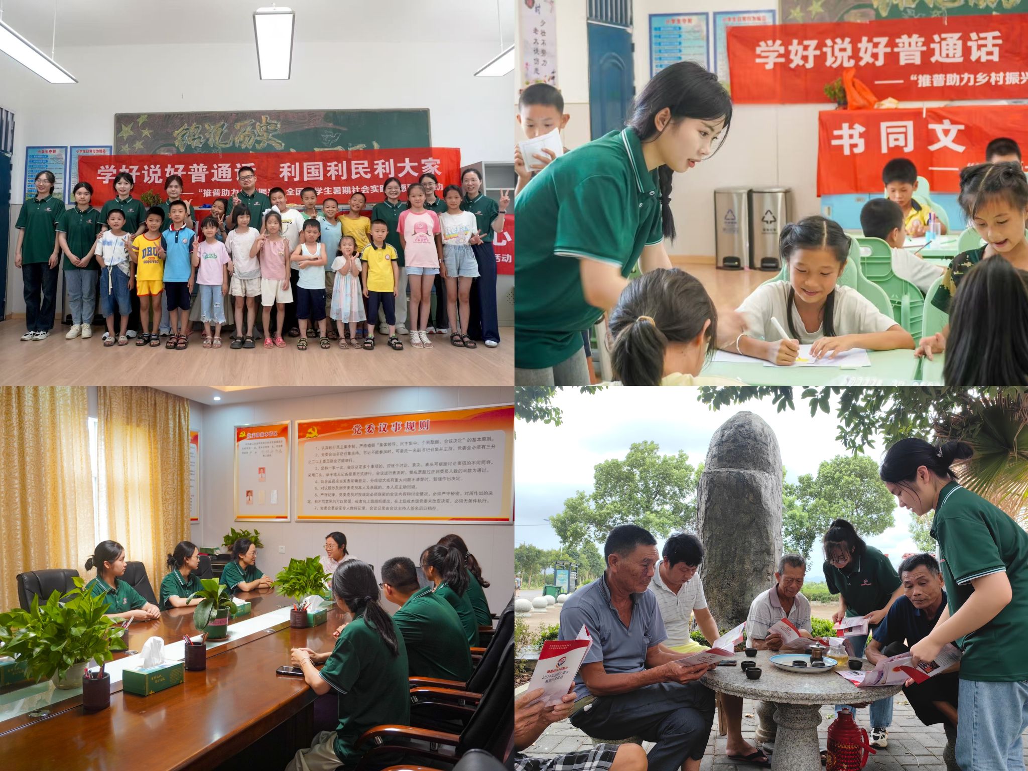 “美语助农人,共绘同心圆”实践团于今年暑假在吉安市峡江县金坪民族乡展开了推普服务活动,实践团队深入金坪民族乡京、侗、瑶、壮等8个少数民族聚居村,通过入户调查、入户宣讲、入校教学、专题讲座、走访代表、普通话推广宣传等形式开展系列活动,普查了当地语言资源,掌握了金坪乡民的普通话现状、丰富的方言资源、民俗文化、对普通话的态度、需求及其背后的动机,为今后长期推行普通话助力乡村振兴掌握真实数据,还增强了当地学生们使用普通话的意识,使孩子们认识到了语言之美,提升孩童的语言认同,实践团成员以实际行动彰显了新时代井大青年学子服务地方的责任与担当。