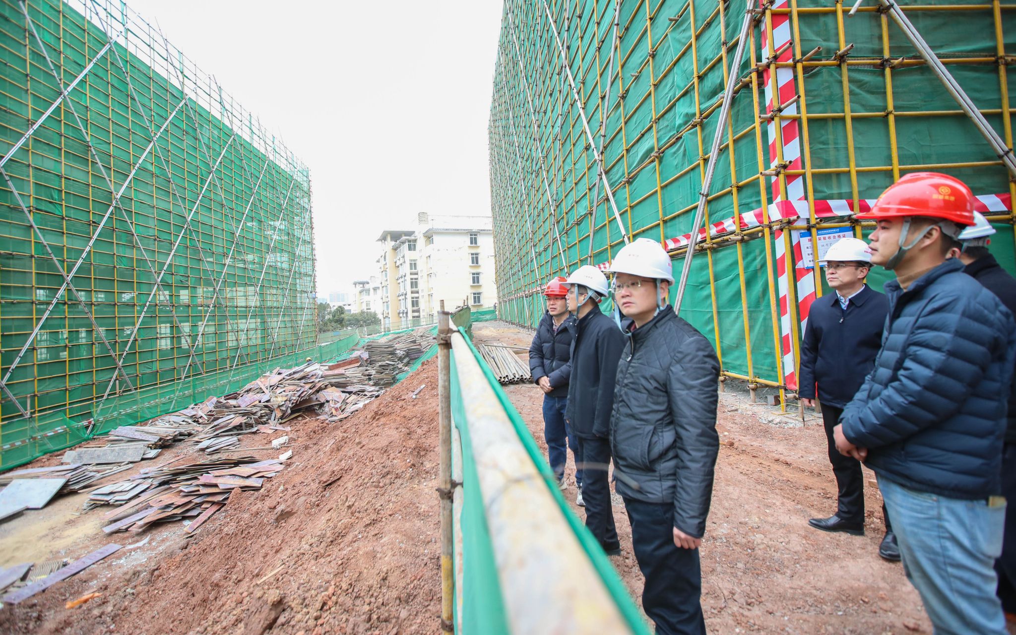 1月9日,校党委副书记、校长罗旭彪,党委常委、副校长敖四江,党委常委、副校长段学民来到学校第42至50栋新建学生宿舍群工地调研工程建设进展有关情况。