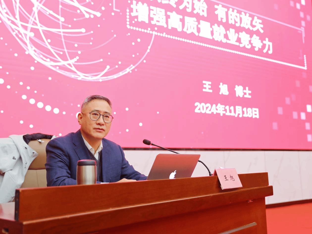 王旭博士分享了《以终为始,有的放矢,增强高质量就业竞争力》的讲座,他从大学生应该如何看待职业生涯切入,分别从就业态势解析、择业认识指导、最佳实践分享三个方面进行深刻讲解,指导学生深入了解自己,为同学们提供职业发展建议,并提出三个建议:可控、可信、可知,倡导大学生自己做择业的决策人,跟随自己的职业兴趣,认清自己的优势,要让自己的个人基本特点和想要的岗位能够匹配起来。