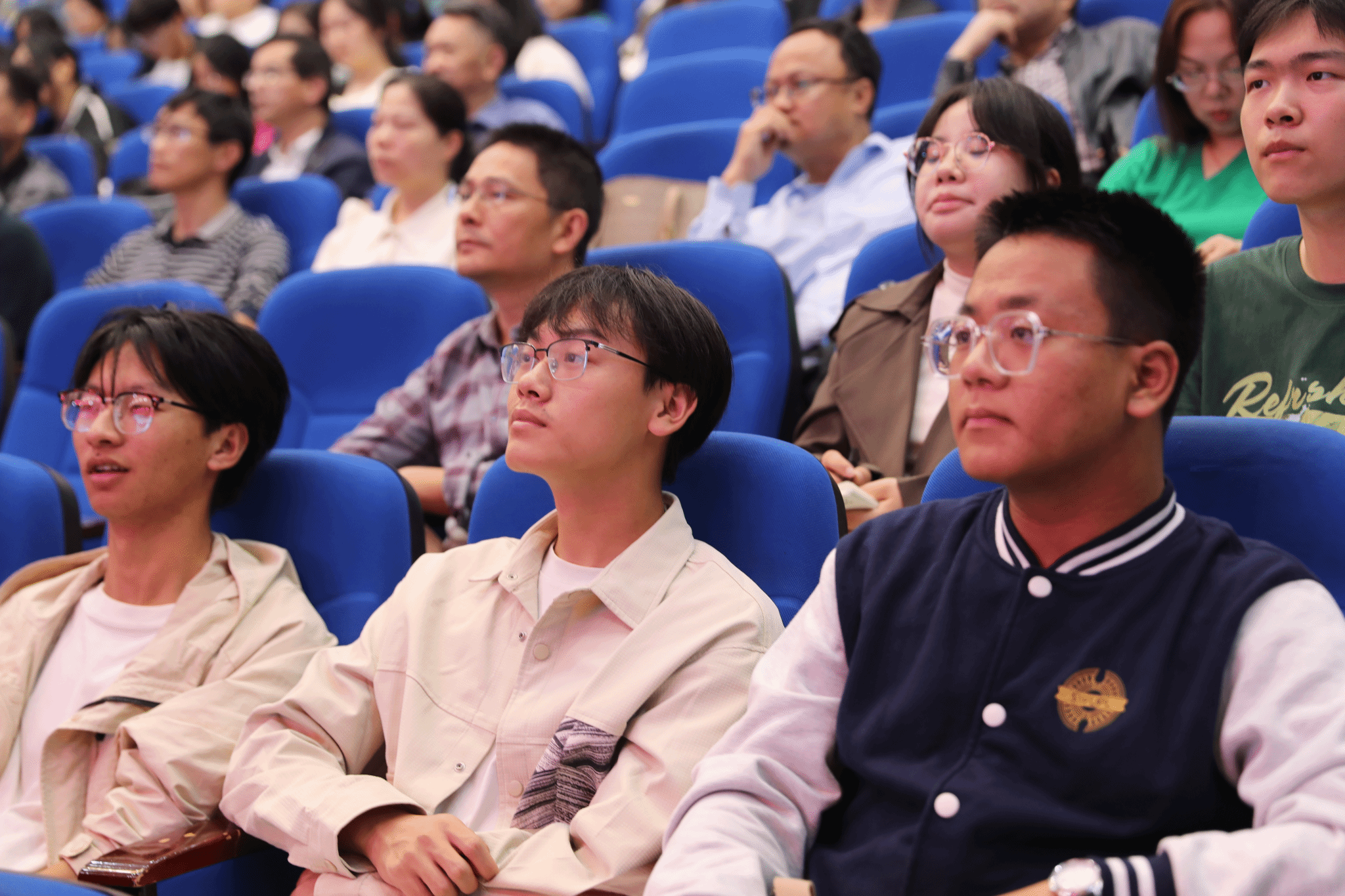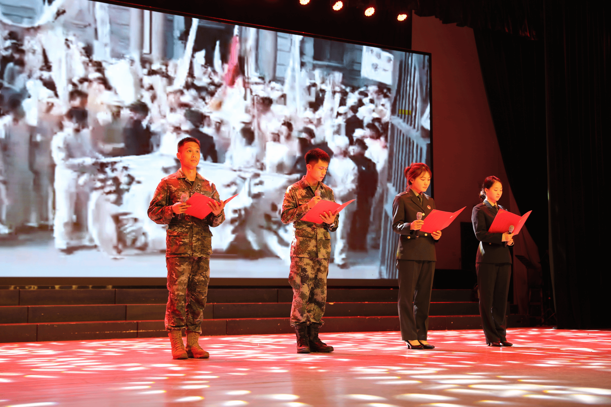 宣讲结束后,现场互动反响热烈。刘槐荫真挚寄语在场的师生:“广大学子要维护好母校的荣誉,珍惜好校友的友谊,为母校发展增添靓丽的色彩。希望同学们珍惜青春,奋斗青春;把握方向,把握自己;磨砺自己,成就未来。争做社会主义的建设者和接班人!”四名在校退役军人为全场观众带来了朗诵表演《英雄》,并向现场观众分享了身着的军装颜色及图案蕴含的意义。随后,在主持人的引导下,全体师生共同诵读了道德规范。铿锵有力的声音在音乐厅回荡,彰显了师生们对道德规范的认同和尊重。