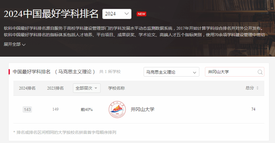 10月15日,2024软科中国最好学科排名正式发布,我校马克思主义理论学科再次登榜,进入全国前40%,位列全国第143名,排名较2023年前进了六位,进一步展现出马克思主义学科特色和建设水平。