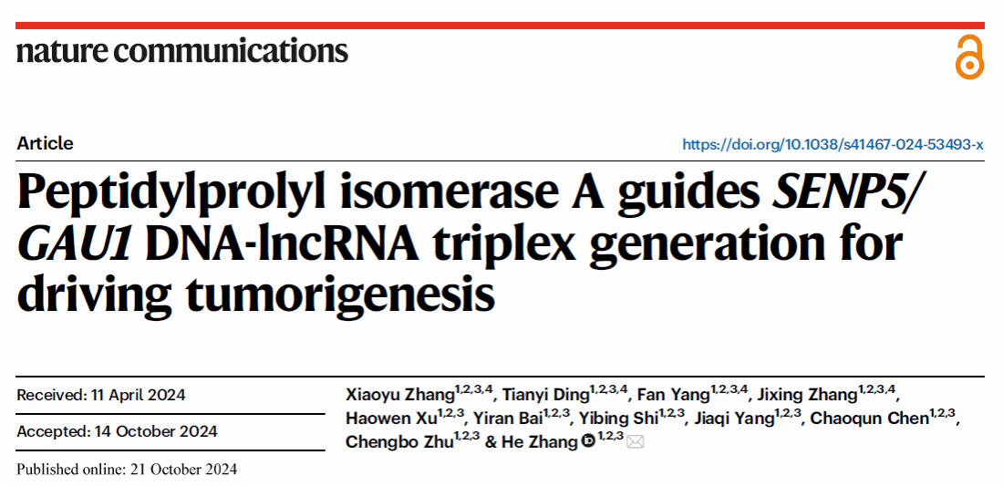 2024年10月21日,我校张赫教授团队在《自然·通讯》(Nature Communications)上发表了题为“Peptidylprolyl isomerase A guides SENP5/GAU1 DNA-lncRNA triplex generation for driving tumorigenesis”的最新研究成果,率先揭示了肽基脯氨酰异构酶A(PPIA)指导的DNA-lncRNA三链体“招募促癌”机制,首次提出了异构酶辅助DNA-RNA杂交体形成的创新概念。
