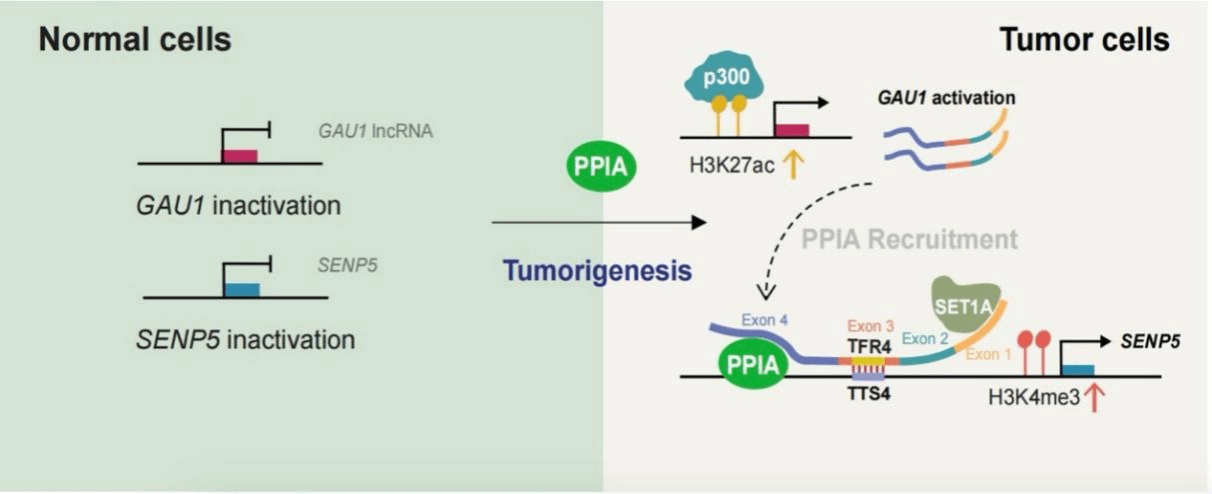 该研究首先发现PPIA与GAU1 lncRNA的第四个外显子结合后,锚定GAU1到癌基因SENP5启动子区,随后诱导GAU1的第三个外显子TFR4 RNA片段与SENP5启动子区的TTS4 DNA片段形成SENP5/GAU1 DNA-lncRNA三链体。这种SENP5/GAU1三链体能进一步吸引甲基转移酶SET1A富集到GAU1的第一个外显子,增加H3K4me3激活SENP5转录,显著促进肿瘤细胞生长和转移。该研究还发现,敲除PPIA后,能显著减少SENP5/GAU1 DNA-lncRNA三链体形成,降低SENP5启动子区的H3K4三甲基化富集,并诱导癌基因SENP5转录失活,抑制肿瘤生长和转移,表明PPIA发挥着关键的三链体形成支架蛋白的作用。