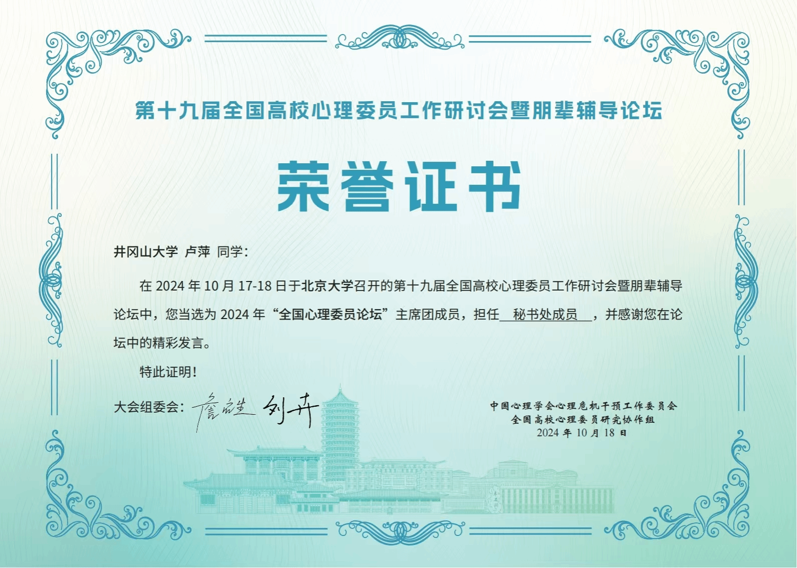 近日,第十九届全国高校心理委员工作研讨会暨朋辈辅导论坛在北京大学隆重召开,会议由中国心理学会心理危机干预工作委员会主办,由北京大学学生心理健康教育与咨询中心承办,我校作为全国高校心理委员研究协作组理事单位参加了会议。