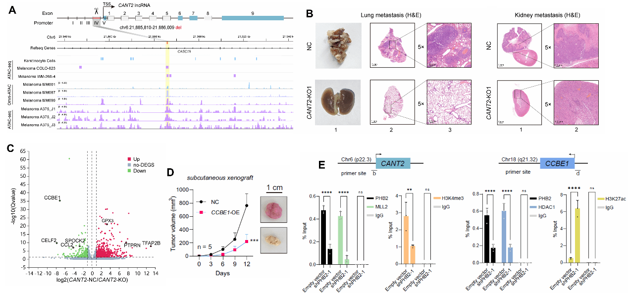 该研究发现,在黑色素瘤细胞中,chr6p22.3位点处于开放染色质状态,为PHB2结合到新发现的CANT2 lncRNA启动子创造了合适条件。PHB2随后招募组蛋白甲基转移酶MLL2结合到CANT2启动子,增加H3K4三甲基化水平,激活致癌lncRNA CANT2的转录激活,显著促进了肿瘤生长和转移。有意思的是,PHB2进一步与激活的CANT2转录本结合,定位到抑癌基因CCBE1的启动子区域。在此过程中,PHB2招募组蛋白去乙酰化酶HDAC1,降低CCBE1启动子区域的H3K27乙酰化水平,抑制CCBE1转录。当敲降PHB2后,PHB2与lncRNA CANT2和编码基因CCBE1启动子的结合水平显著下降,两种组蛋白修饰因子结合均同步下降,显著改变组蛋白修饰水平,使CANT2和CCBE1的转录水平同时变化,表明PHB2是新发现的具有协同调控lncRNA-基因转录的关键穿梭因子,为肿瘤潜在治疗提供了新的靶点选择。