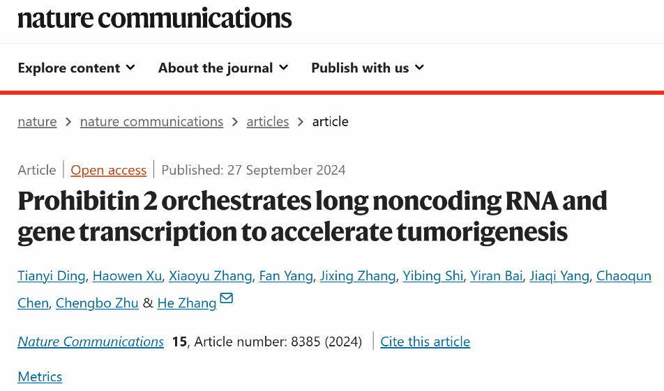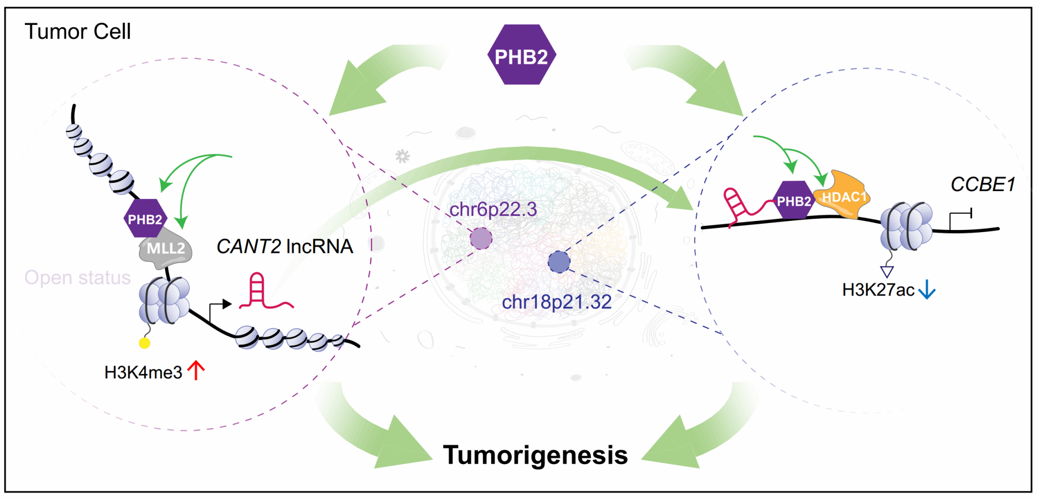 2024年9月27日,张赫教授团队在《自然·通讯》(Nature Communications)上发表了题为“Prohibitin 2 orchestrates transcription of long noncoding RNA and coding gene to accelerate tumorigenesis”的最新研究成果,发现Prohibitin 2(PHB2)作为穿梭因子,调控了CANT2 lncRNA和编码基因CCBE1的异常协同转录,加速恶性黑色素瘤的发生发展,阐明了肿瘤表观遗传调控新模式。