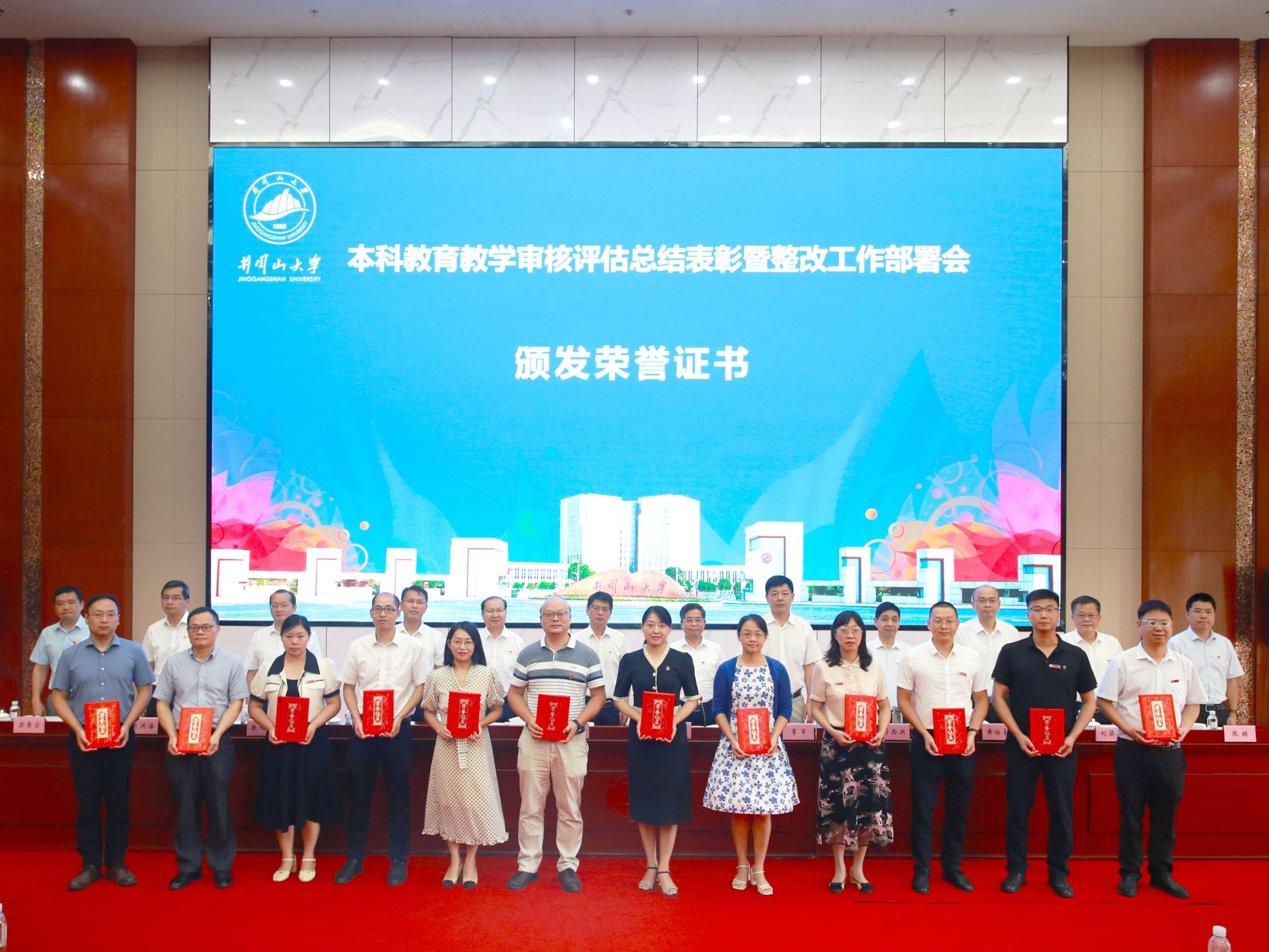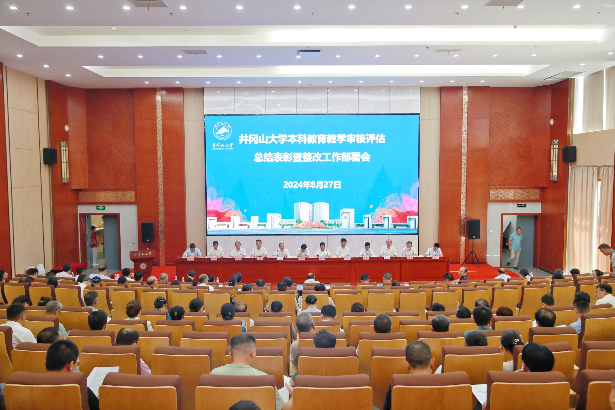 为表彰先进,进一步明确目标、凝聚共识,全力做好本科教育教学审核评估后续工作,8月27日上午,学校召开本科教育教学审核评估总结表彰暨整改工作部署会。校党政领导班子全体成员出席会议,校党委委员、校纪委委员、全体正副处级干部以及受表彰的先进集体和个人参加会议,学校各民主党派和统战团体负责人列席会议。党委副书记、校长罗旭彪出席会议并作总结讲话,党委副书记肖宜安主持会议,党委常委、副校长黄俭根宣读《本科教育教学审核评估表彰决定》,党委常委、副校长黄族豪作本科教育教育审核评估总结暨整改工作部署。