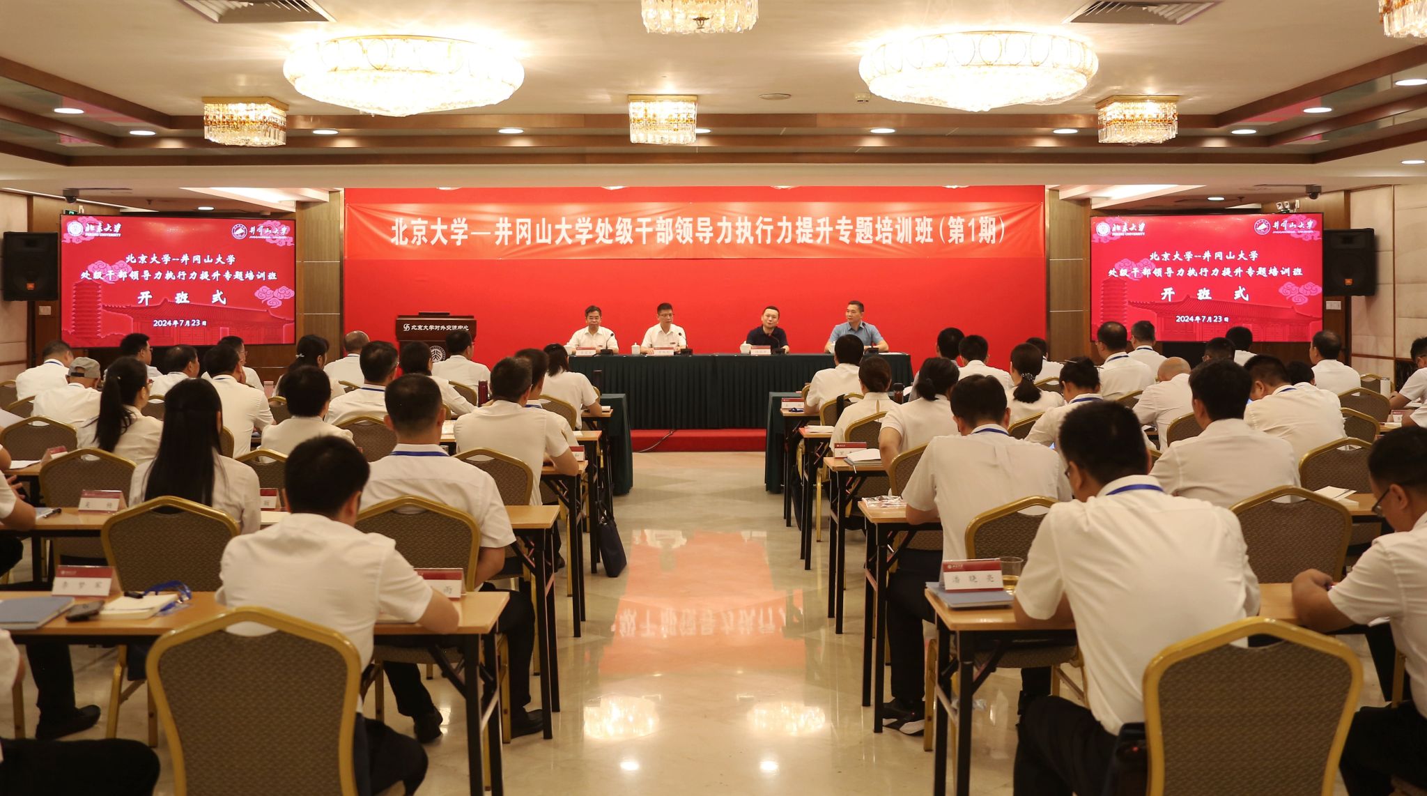 7月23日,我校第一期处级干部领导力执行力提升专题培训班在北京大学顺利开班。井冈山大学党委副书记、校长罗旭彪出席开班仪式并作动员讲话,北京大学党委常委、副校长任羽中致欢迎辞,北京大学继续教育学院院长李本纲主持开班仪式。肖宜安、李军、冷明、敖四江、黄族豪、肖洪海、刘梁军、梁景宏、张赫等领导出席,部分处级干部参加开班式。