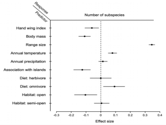 图2. 预测鸟类亚种数量的模型的系数估计