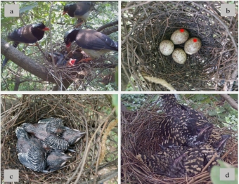 图3.(a)三只红嘴蓝鹊在育雏,(b)红嘴蓝鹊巢中被噪鹃多重寄生,红色标记的为噪鹃卵,另2枚为红嘴蓝鹊卵,(c-d)两只噪鹃雏鸟。