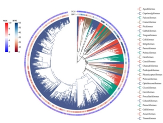 图1. 全球7092个鸟类物种的亚种数和手翼指数分布情况