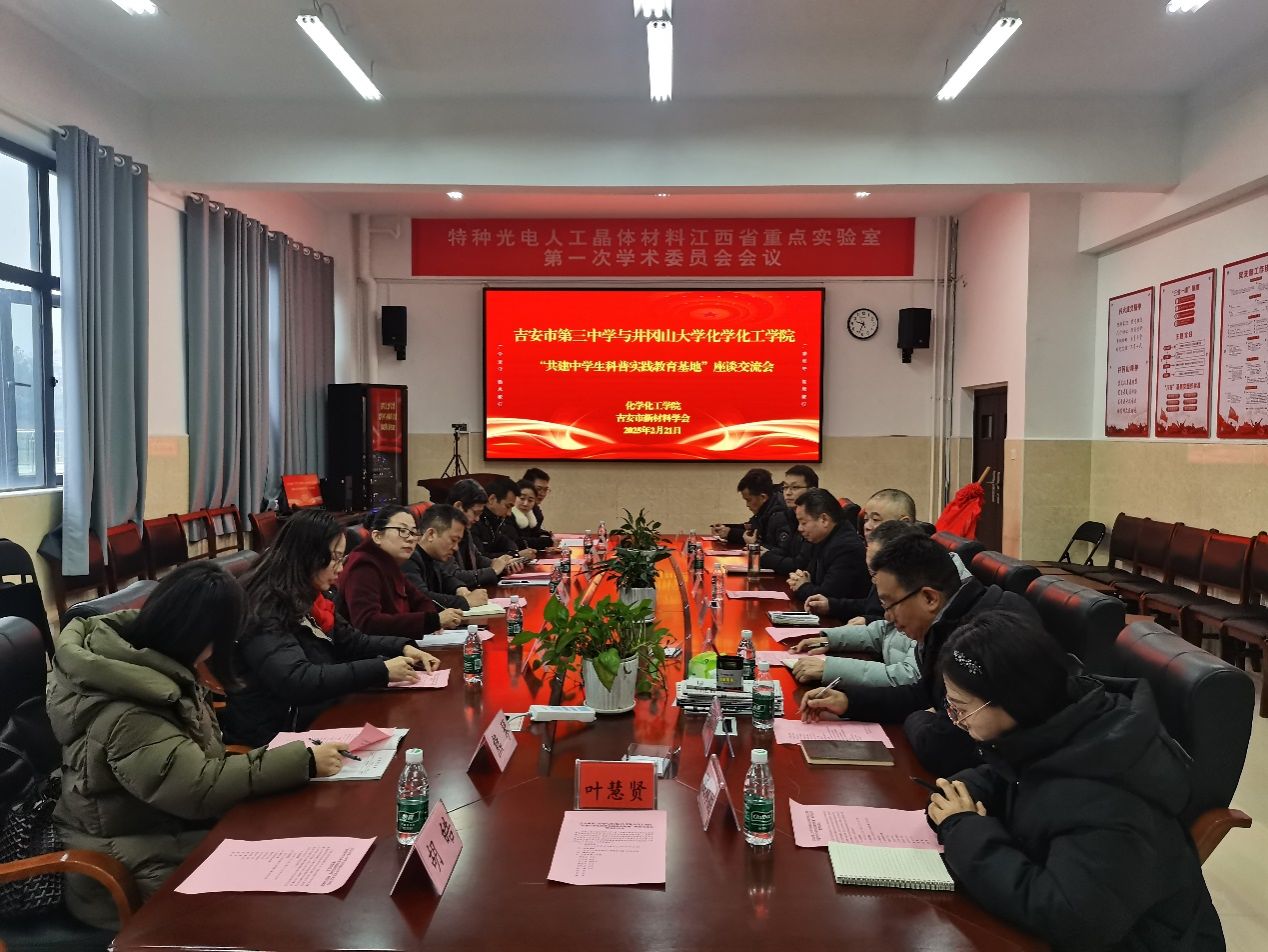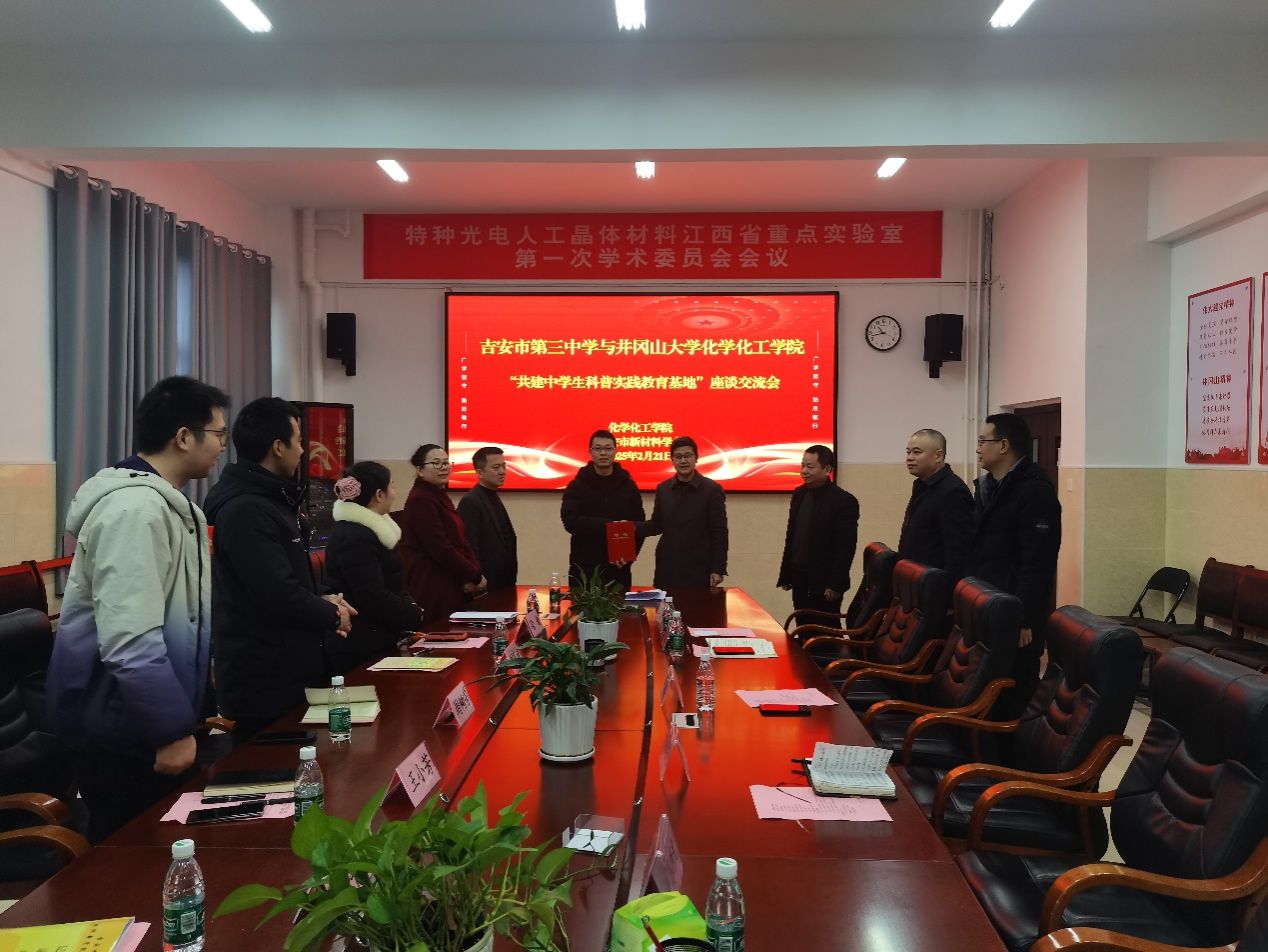 为深入落实协同提质工作,进一步整合高校与中学的优质教育资源开展合作共建,提升学生的科学素养与综合能力,探索创新人才培养的新模式,促进中学生科学素养提升和高校化学专业人才培养一体化发展,2025年2月21日上午,吉安市第三中学与井冈山大学化学化工学院“共建中学生科普实践教育基地”座谈交流会暨签约仪式在化学化工学院新大楼324会议室隆重举行。吉安市第三中学党委负责人周树芳,校长刘东波,副校长王小芳及教务处、科研处负责人和青年教师代表参加座谈,化学化工学院党委书记康云峰,院长陈文通,副院长刘诚,应用化学研究所副所长易绣光,副院长韩润林及化学系教师代表出席座谈会并参加签约仪式,会议由康云峰主持。