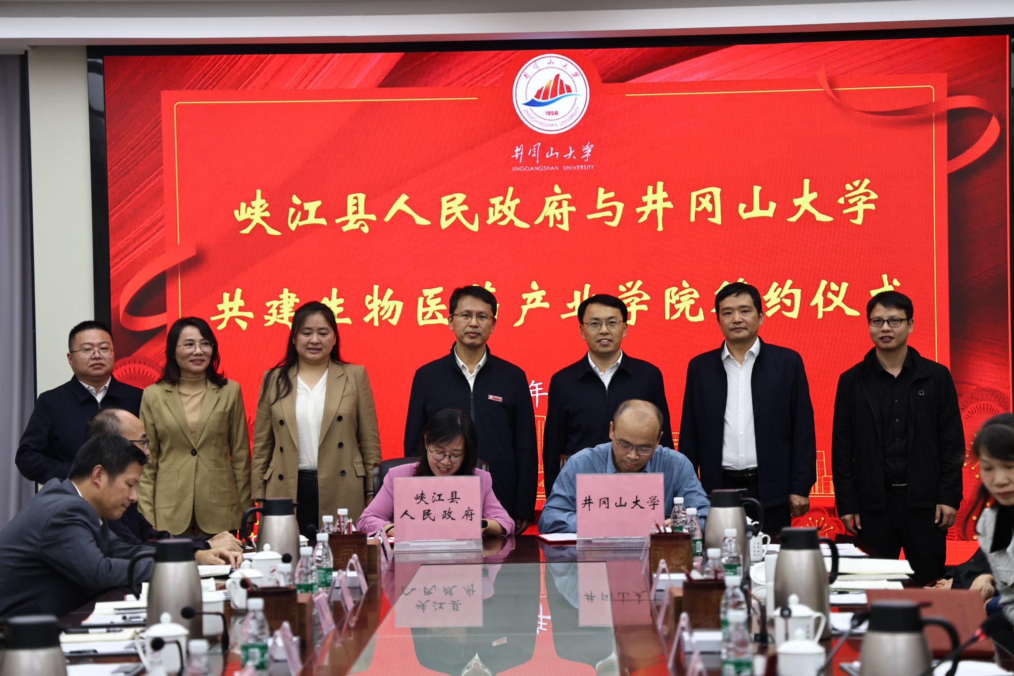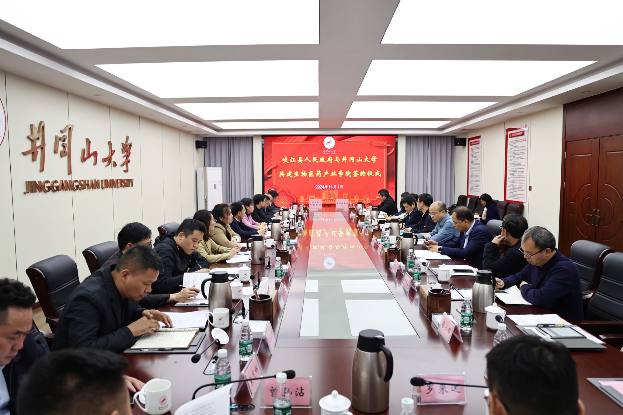 11月1日,2024年峡江县“书记部长进校园”活动暨共建生物与医药现代产业学院签约仪式在我校举行。井冈山大学党委副书记、校长罗旭彪会见了峡江县代表团一行,党委常委、副校长冷明,峡江县委副书记董兴开出席签约仪式并致辞。党委常委、副校长黄族豪主持仪式,并与峡江县委常委、组织部部长陈仁华共同签订共建生物与医药现代产业学院合作协议书。校党委常委、组织部部长梁景宏出席。双方有关部门负责人参加。