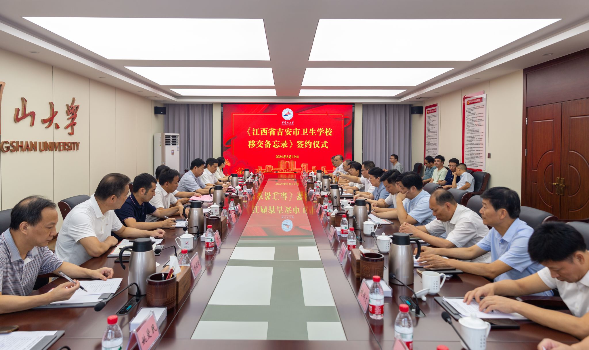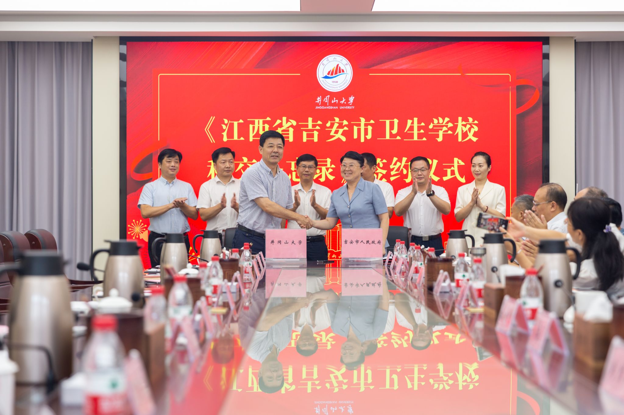 8月19日,学校和吉安市人民政府举行《江西省吉安市卫生学校移交备忘录》签约仪式,省委教育工委委员、省教育厅副厅长王勇,吉安市人民政府副市长周密,井冈山大学党委常委、副校长李军出席并讲话,周密和李军分别代表双方签订备忘录。井冈山大学党委常委、组织部长梁景宏,青原区政府区长曾昭君等出席仪式。