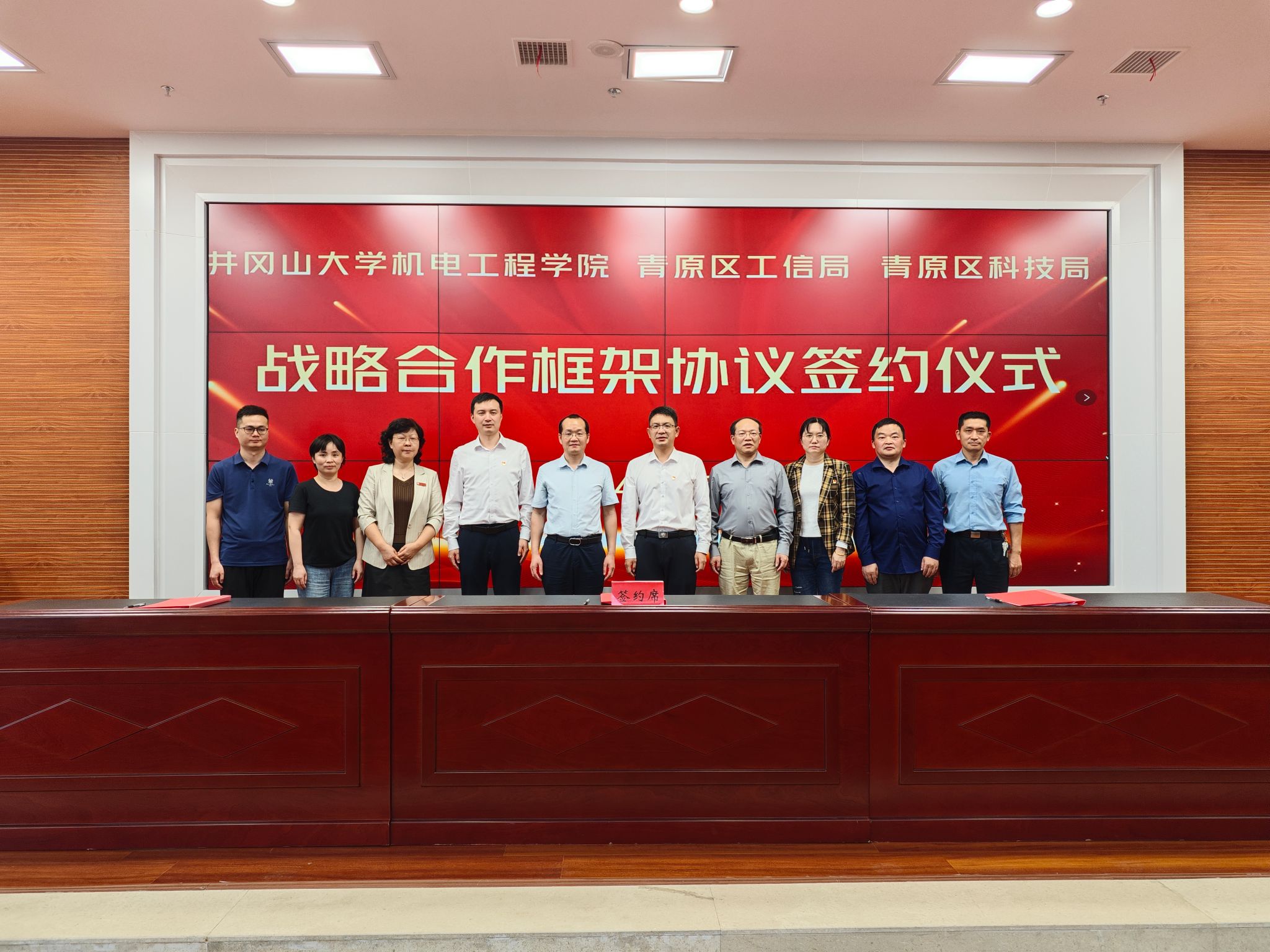 为了扎实落实我校与青原区基层党建共创工作,5月6日下午,机电工程学院与青原区工信局、科技局在青原区工人文化宫会议室举行战略合作框架协议签约仪式。井冈山大学党委常委、副校长敖四江,青原区委常委、副区长陈嵩出席仪式并讲话。青原区工信局党组书记、局长龙飞,青原区科技局党组书记夏淑萍,机电工程学院党委书记傅小丹、院长郑大腾以及学院博士教师代表、青原区企业代表参加签约仪式。