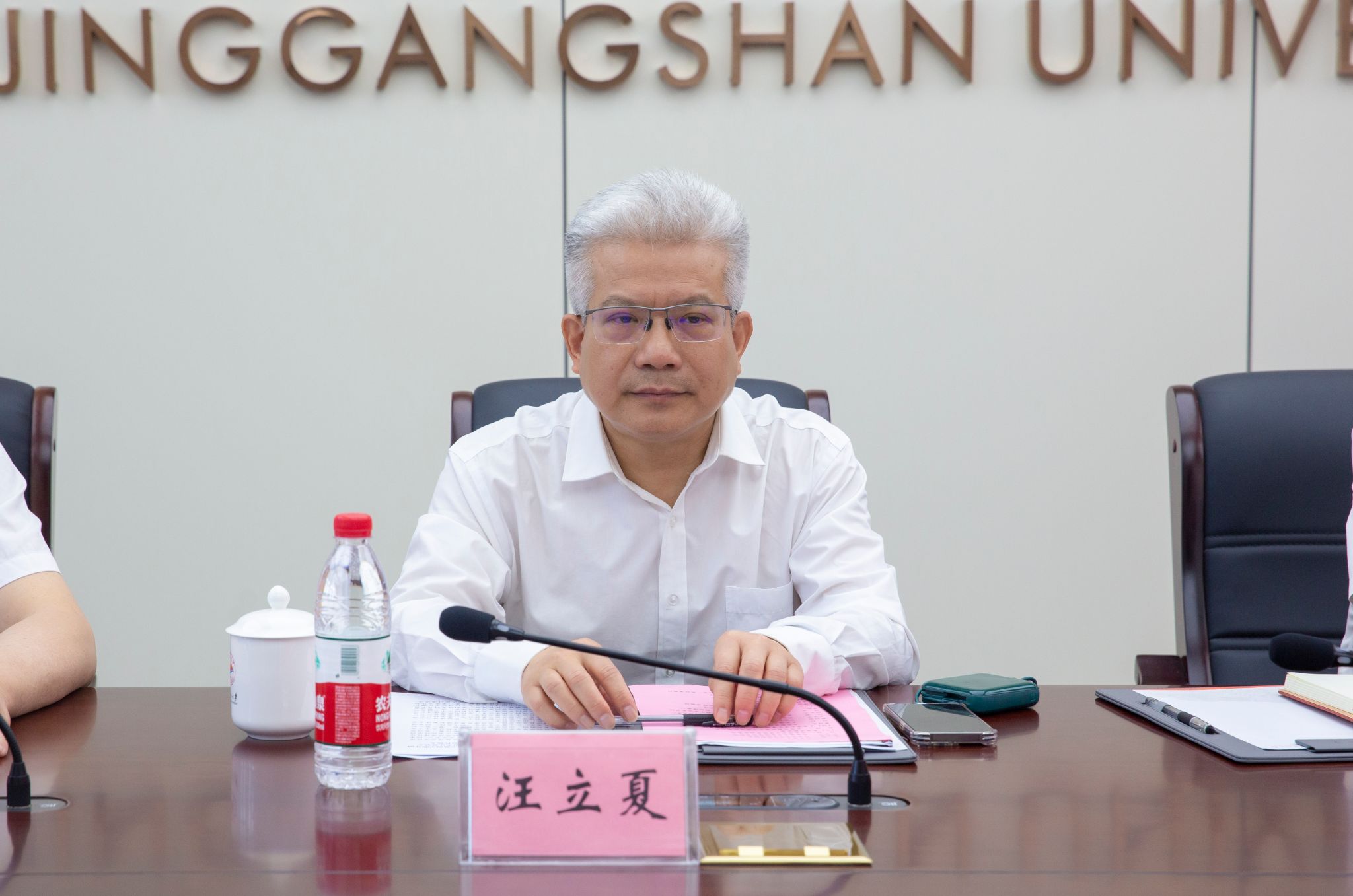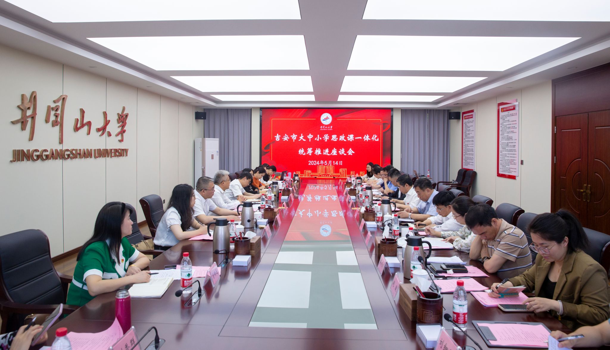 5月14日,省委教育工委委员、省教育厅副厅长汪立夏在我校召开吉安市大中小学思政课一体化统筹推进座谈会。省教育厅教育评估院高教所、教育厅社政处相关负责人出席,井冈山大学党委书记胡春晓会见了汪立夏一行,井冈山大学党委副书记、校长罗旭彪,党委副书记肖宜安出席。吉安市教体局、吉安职业技术学院、吉安幼儿师范高等专科学校、白鹭洲中学、井冈山大学附属中学、井冈山大学附属学校、井冈山中学、吉安师范附小、吉安县君山小学、峡江县金坪民族乡小学等学校领导和思政课老师参加了座谈会。
