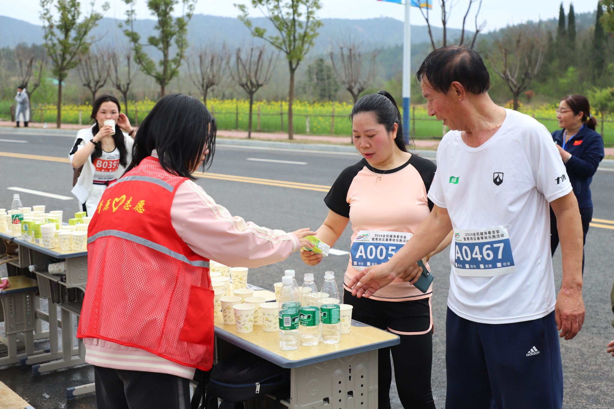 比赛前,志愿者们依据赛事组委会下发的工作安排,明确自身职责和分工,坚守在起点、补给站、医疗站、半马终点好耶欢乐跑终点等关键点位,为比赛的顺利进行提供保障。比赛现场虽细雨纷飞,但这并丝毫没有影响志愿者们的热情,他们严阵以待,随时为参赛选手提供贴心服务。在入场检录处,志愿者们仔细核对运动员信息,井然有序地摆放物品;在能量补给站,他们为运动员准备好茶水和食物,同时为他们加油助威;医疗志愿者积极协助医护人员为运动员提供赛后医疗服务,为各位参赛选手提供健康保障;选手接驳组的志愿者坚守岗位,在运动员到达终点时,及时提供给接驳车引导服务。近2小时的赛事服务,全体志愿者们不辞辛苦、尽职尽责,用他们的热情和敬业确保了赛事全程的顺利进行。