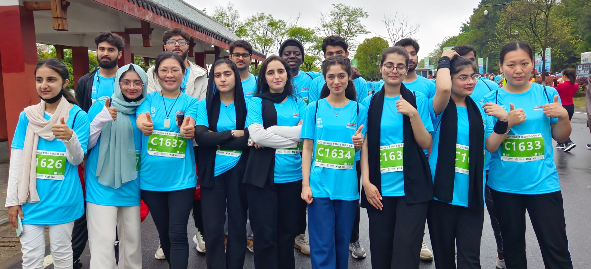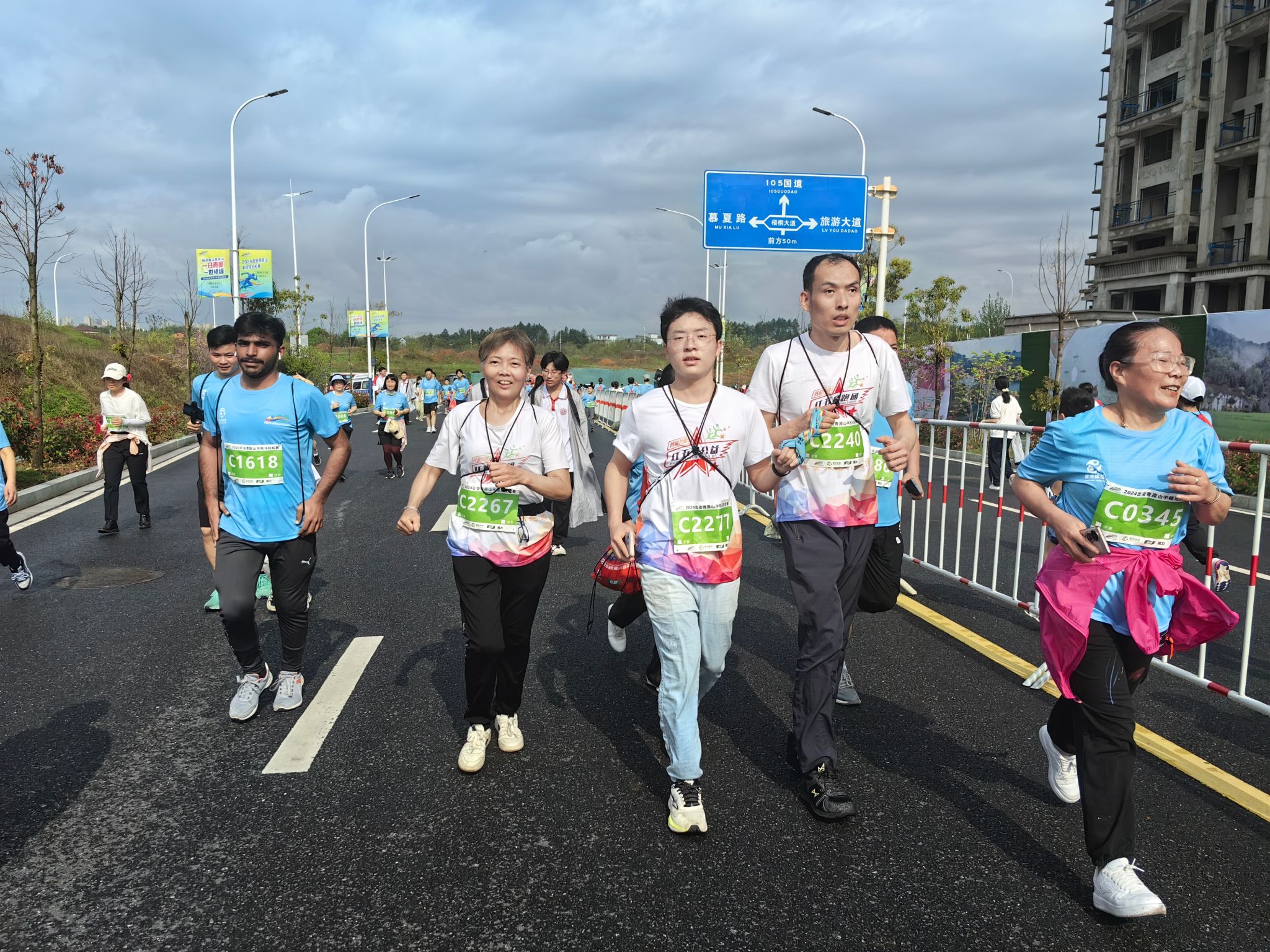 跑进春色里,跑进青原山。近五千名跑者齐聚一堂,用双脚探寻青原山的自然之美,用心灵感受庐陵文化的深厚底蕴。在这群奔跑的身影中,井大的学子们格外引人注目,组建四大独具特色跑团,构筑成赛事中的一道璀璨风景线。 来自巴基斯坦、赞比亚的20名留学生参加了健康跑项目,一起赏美景、品春色、强体魄、提精气,用奔跑的方式传递着友谊与和平、健康与活力。他们的参与丰富了赛事的文化内涵,搭建起了一座中外文化交流的桥梁。汉服跑团的30名传统文化爱好者,身着飘逸的汉服,仿佛穿越时空而来,在赛道上奔跑。他们将传统与现代完美融合,展现出中华文化的独特韵味。红五星助盲跑团的70余名爱心助跑同学,人对人、点对点,拉着30名盲友的手,步调一致、前后相随,完成了各自的目标里程。其中来自新干县的盲友张先生早晨5点就起来了,打车来到青原山,在两名同学的帮助下完成了多年跑半马的心愿。井大青年学生跑团,身着统一服装,热情洋溢地奔跑在赛道上,成为一道亮眼的风景线。他们作为青春的代言人,以独特的风采和坚韧的意志,在马拉松赛道上尽情展现着青春的活力与创造力,为赛事增添了浓厚的青春气息。