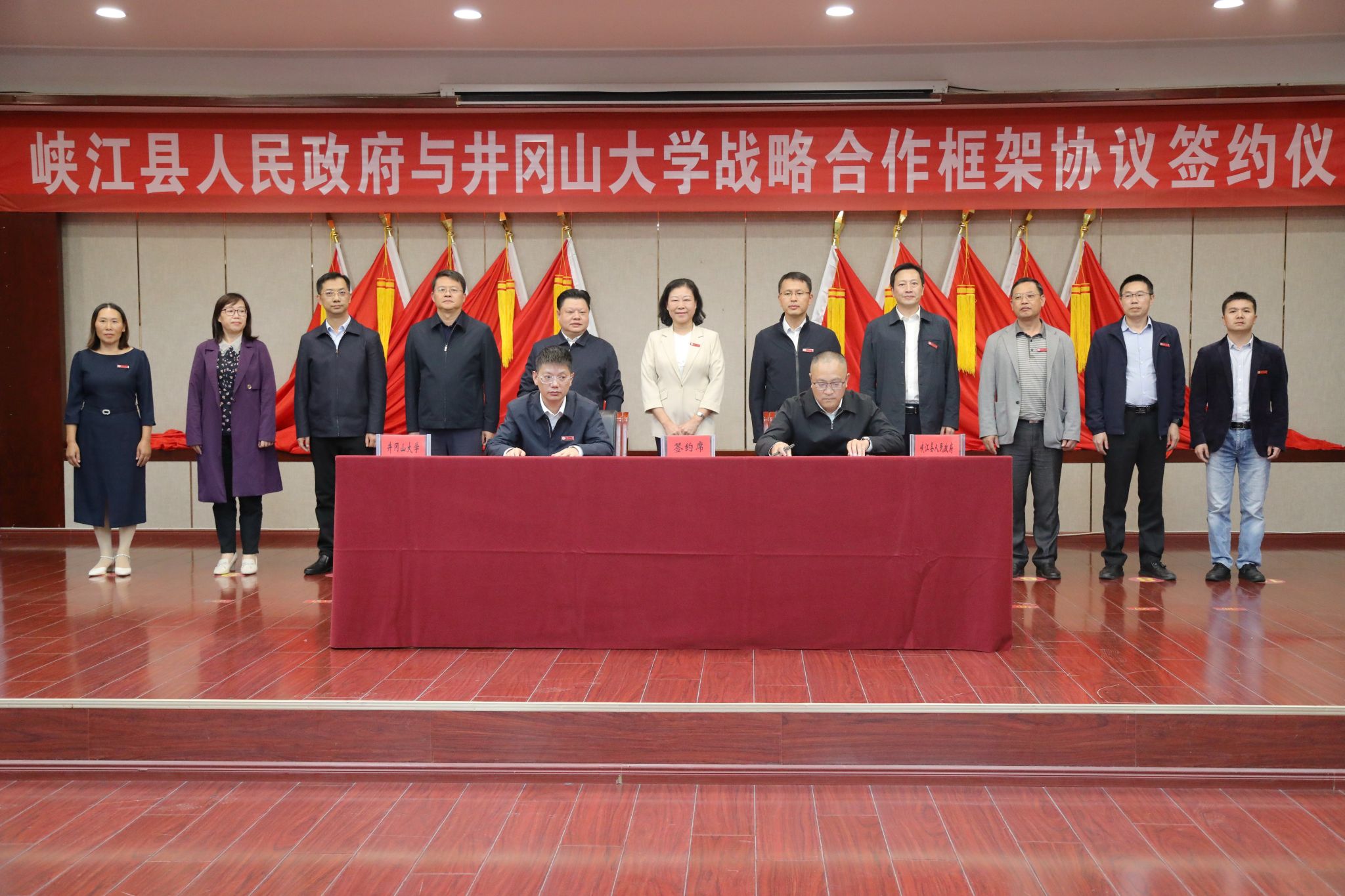 10月23日,我校与峡江县人民政府战略合作框架协议签约仪式在峡江县举行。校党委书记胡春晓、峡江县委书记尹嵘峰分别致辞。校党委副书记、校长罗旭彪与峡江县委副书记、县长谢启龙签约。校党委常委、副校长冷明,峡江县领导聂建林、李宁宇、陈仁华等出席,峡江县有关部门负责人以及我校有关部门、学院负责人参加仪式。
