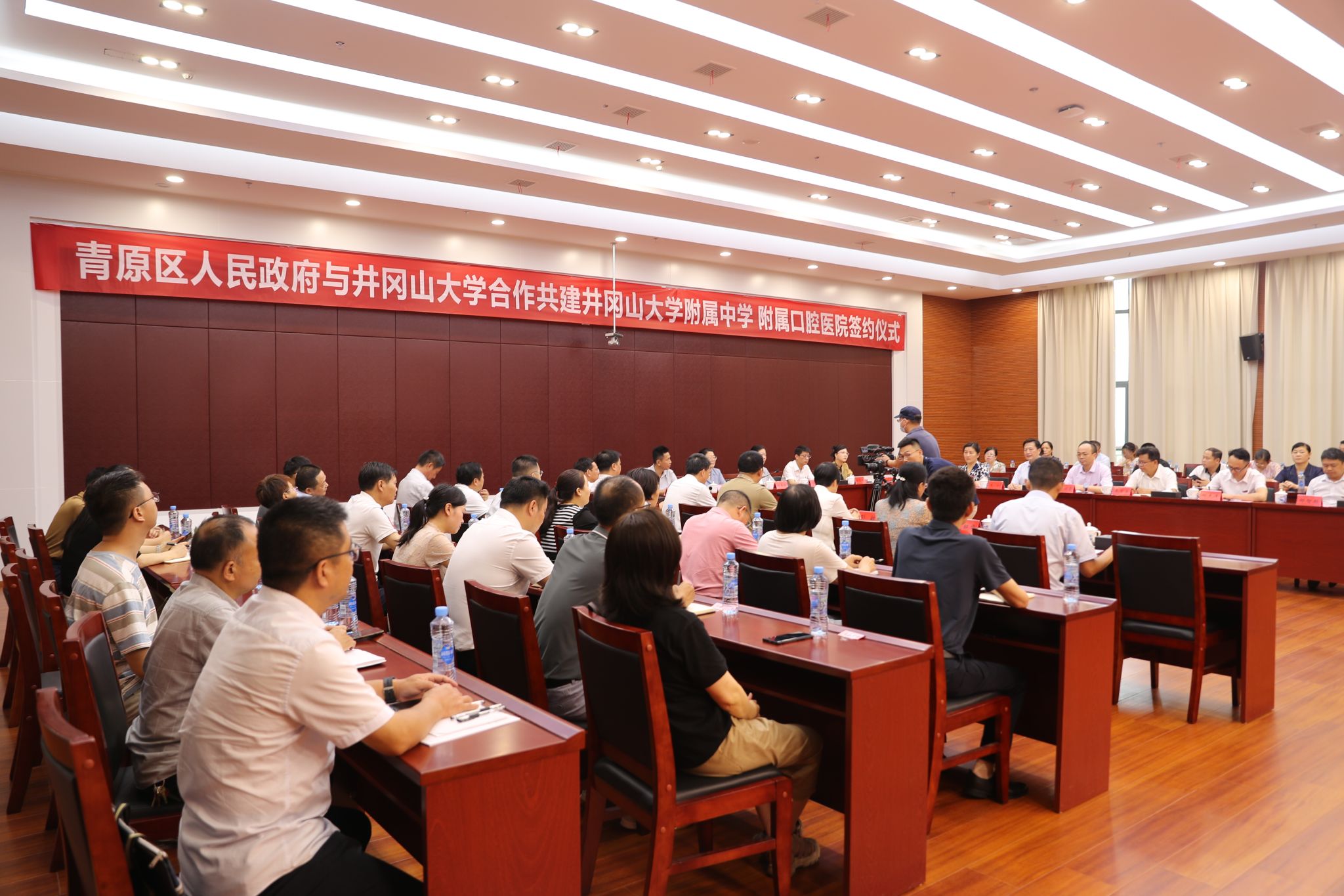 7月19日,青原区人民政府与井冈山大学合作共建井冈山大学附属中学、附属口腔医院签约仪式举行。副市长周密,井冈山大学党委书记胡春晓,党委副书记、校长罗旭彪,党委常委、副校长刘利民、廖岚,青原区委书记匡晓卫,区委副书记谢晓东、区人大常委会主任王克齐等出席。
