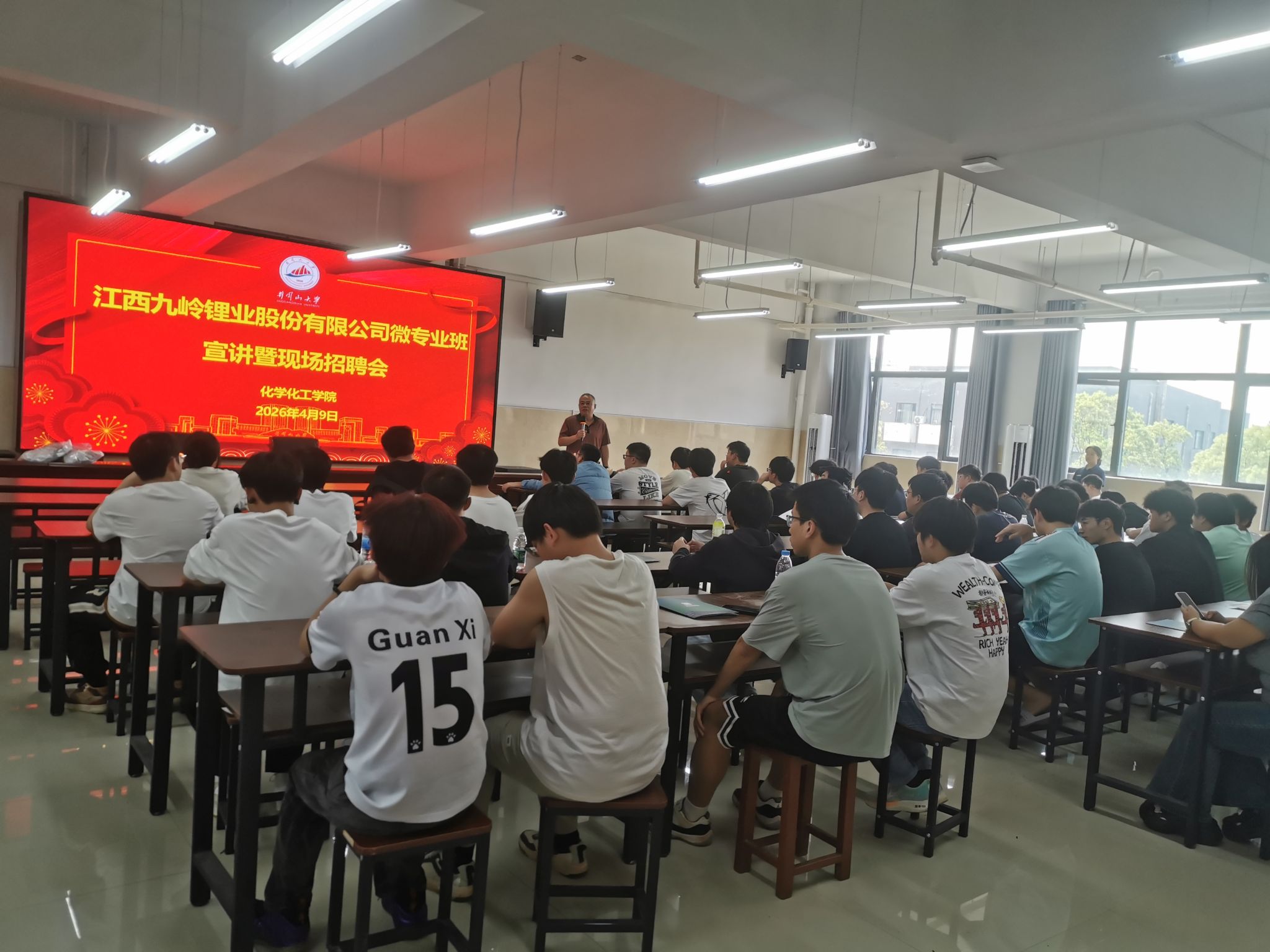 为深化产教融合、拓宽人才培养与就业渠道,4月9日下午和4月10日上午,江西九岭锂业股份有限公司人力资源总监邓亮亮一行应邀来化学化工学院举行微专业班招生宣讲暨现场招聘会。学院院长陈文通及200余名相关专业学子参加活动。