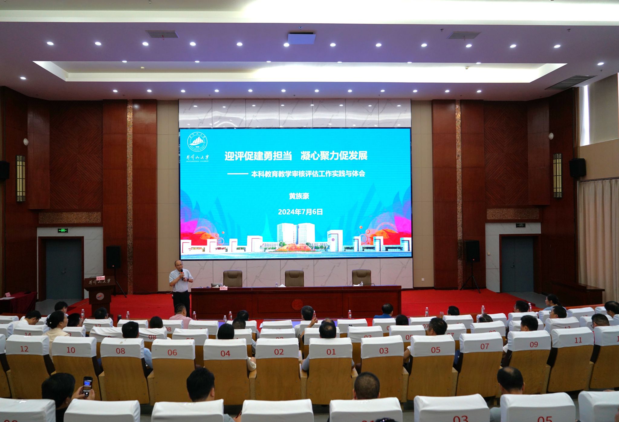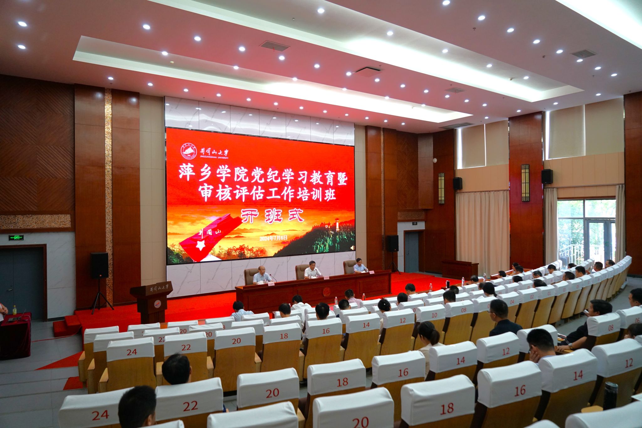 7月6日,萍乡学院党纪学习教育暨审核评估工作培训班开班式在我校举行。萍乡学院党委书记邱晓辉致辞。井冈山大学党委副书记肖宜安致辞,党委常委、副校长黄族豪主持开班式并为学员作题为《迎评促建勇担当 凝心聚力促发展——本科教育教学审核评估工作实践与体会》的专题辅导报告。活动由萍乡学院主办,井冈山大学承办。我校继续教育与培训学院相关负责人和萍乡学院党纪学习教育暨审核评估工作培训班成员参加开班式。